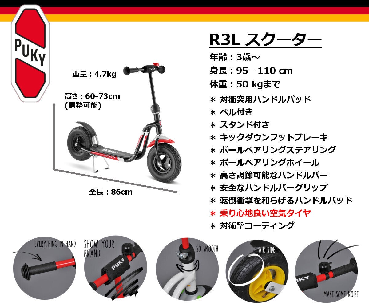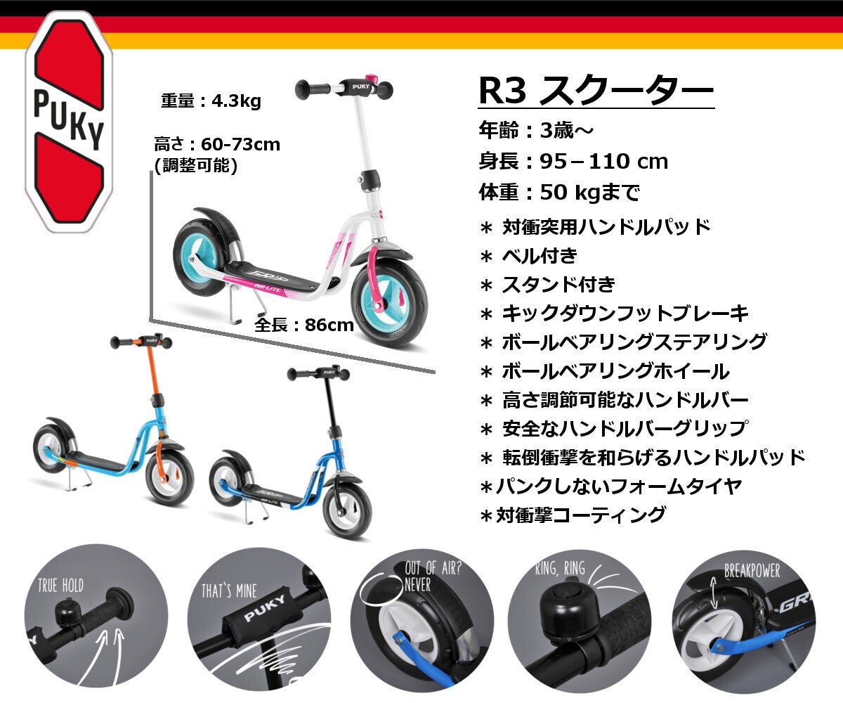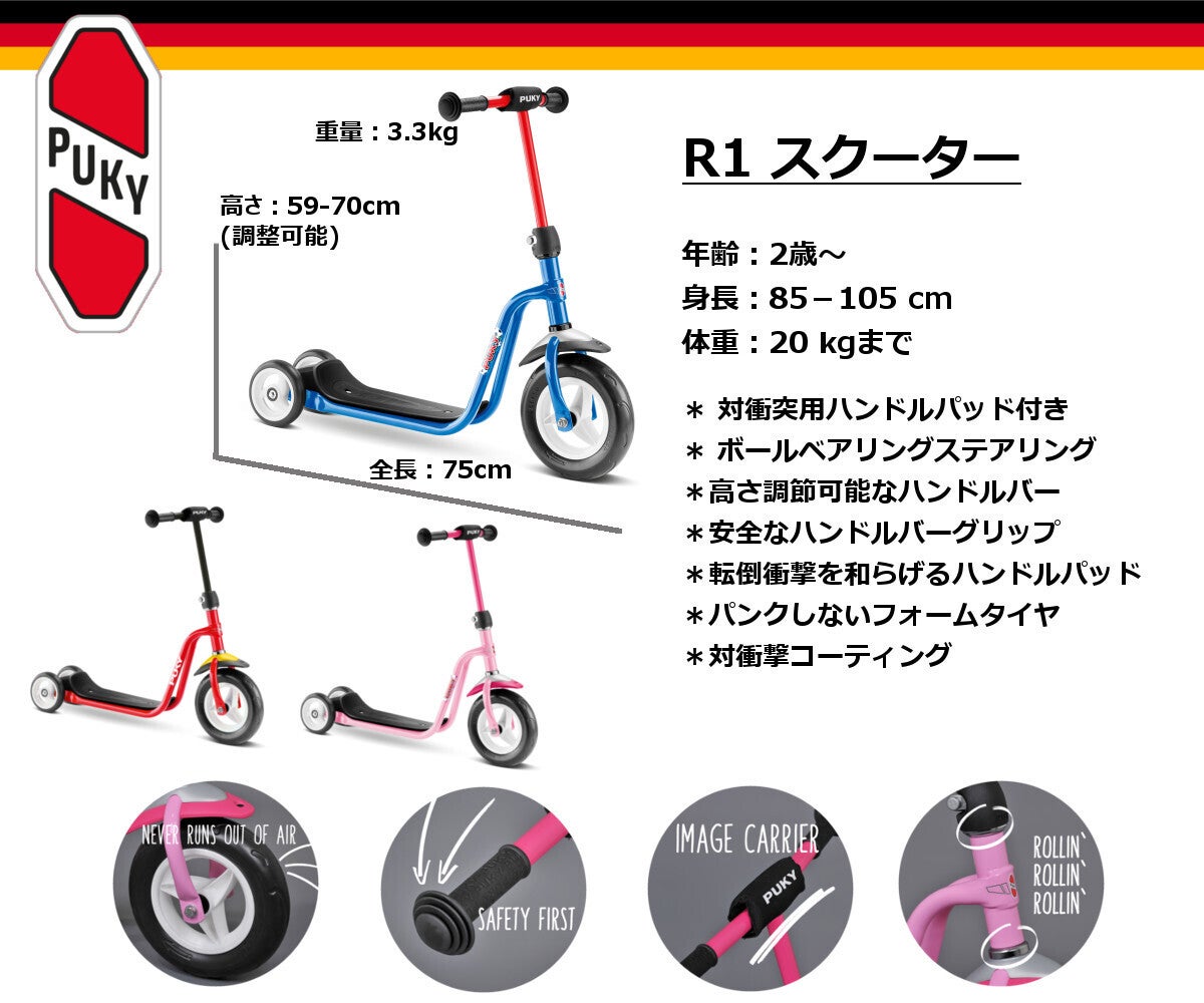 R1スクーターはPukyモデルのスクーターの中のエントリーモデルです。スクーターはバランス感覚の他に足の筋力や体幹を鍛える事が出来ます。対象年齢な2歳からで、スクーターながらも『ラーニング』スクーターと呼ばれており、名の通りお子様の教育に寄与するように設計されています。後輪の二輪は小さいお子様の運動能力を考慮して安定性を高め、足を置くふっとボード部分も滑らないように滑り止めが付いています。ハンドルの両端には転倒した時に手を傷めないハンドグリップが付いていますし、ハンドルの中央にパッドも付いており、全体のフレームにも対衝撃コーティングを施しており転倒時の衝撃を和らげます。音がほとんど出ずパンクの心配のないフォームタイヤを使っていますので音やパンクを気にする必要もありません。ステアリングにはボールベアリングを使っていますのでスムーズなハンドリングが出来る他、耐久性も高いものとなっています。