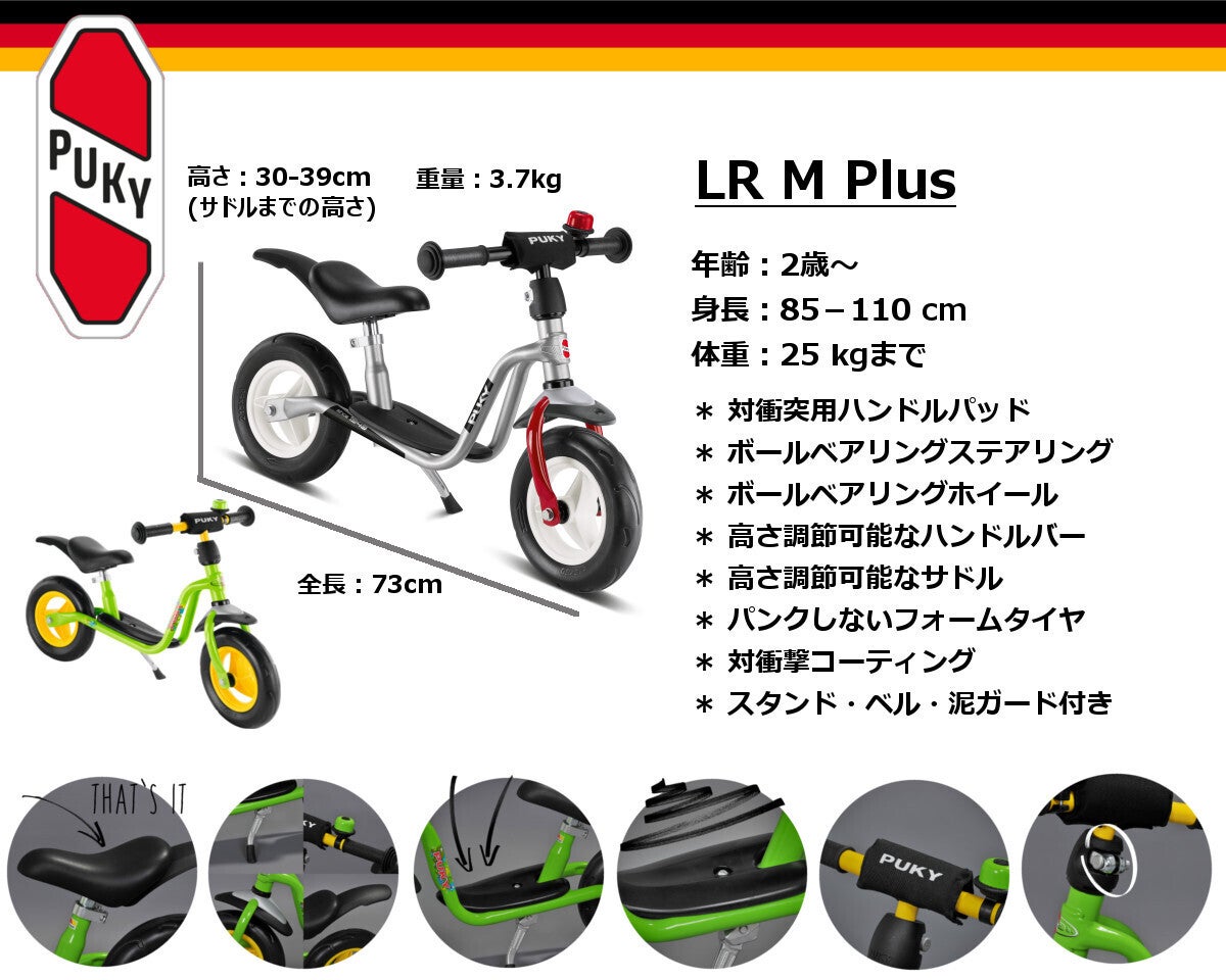 LR Mはお子様にとって最初の二輪車となります。このラーニングバイクは2歳のお子様から乗る事ができ2輪車の理想的な出発点となります。他の車と異なり自分でバランスを取らなければ転倒してしまう乗り物ですのでバランス感覚とそれを生み出し維持する筋力、運動能力の発達に貢献します。タイヤはメンテンナンスやパンクの心配なく使えるフォームタイヤで、ハンドルの両端にはグリップが付いており転倒時の衝突を和らげます。ハンドルは意図的に制限なく回るようにされておりますので、転んだ時にハンドルが地面に水平におかれ怪我の危険性を大きく低下させています。サドルの形もバナナ型に設計されており、スピードが出てもその勢いが体にかかるのではなく車輪にかかるようになっており、バランスを維持しやすくなっています。足を載せるボードも付いていますので、ある程度のスピードが出たら足を乗せて進む事が出来ます。またサドルとハンドルは高さの調節が可能ですので体に合わせて長い期間お楽しみ頂けます。