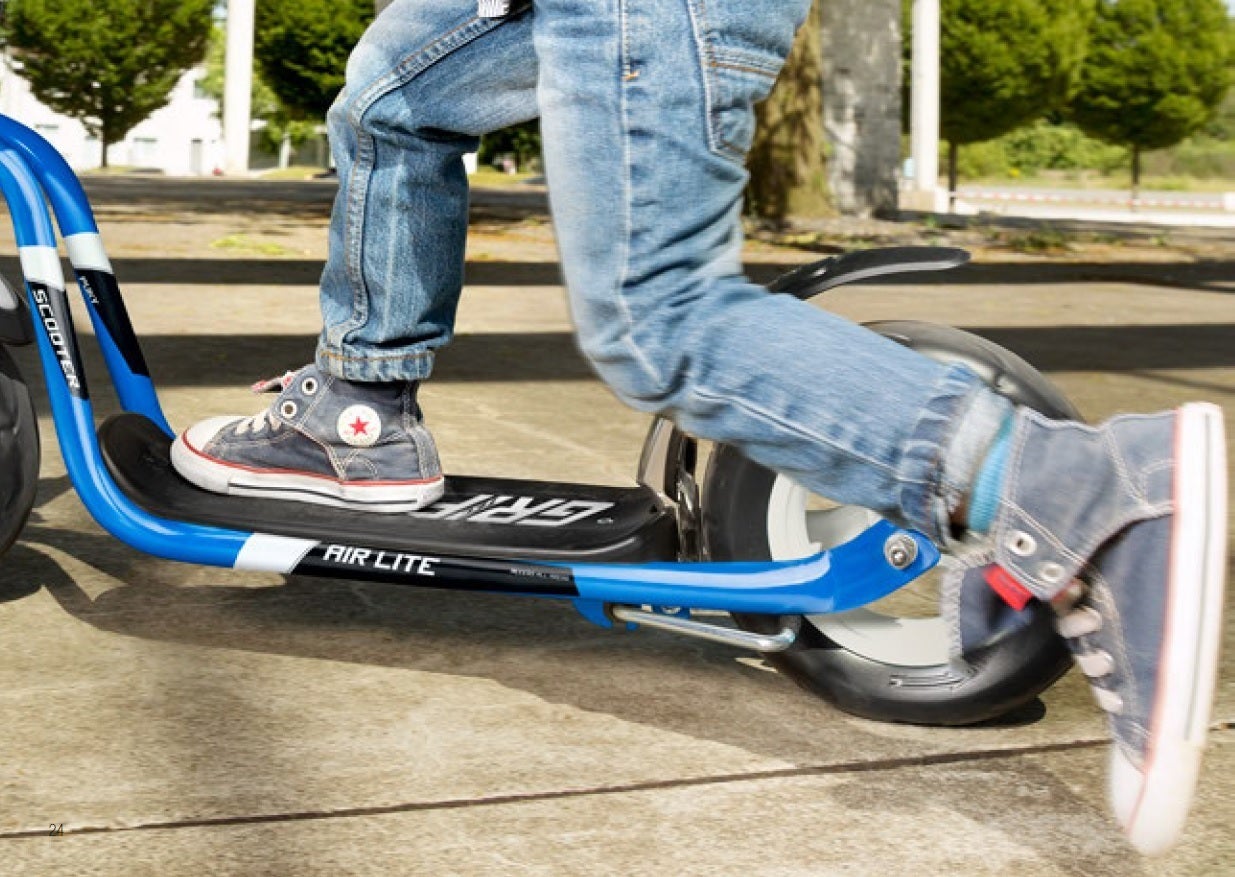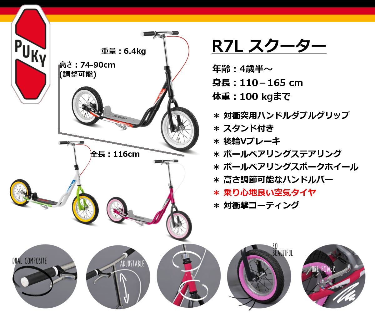 R7Lスクーターは4歳半の子供から使える大きめのスクーターです。対象の身長は110-165cm、体重は100kgまでと大人でも使用出来るサイズになります。12.5インチのエアータイヤとスポークホイールで乗り心地良く、後輪のVブレーキでスムースに速度を落とせます。子供用ながら大人用のスクーターとしての機能を備えており、ブレーキ操作・バランスの維持などを通してスクーターの乗りこなし方を学ぶ事が出来ます。グリップは二重構造となっており、転倒した時の衝撃を和らげます。ハンドルの高さ調節可能、スタンド付きです。