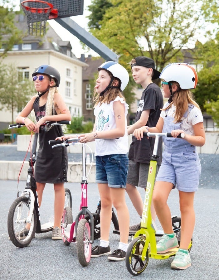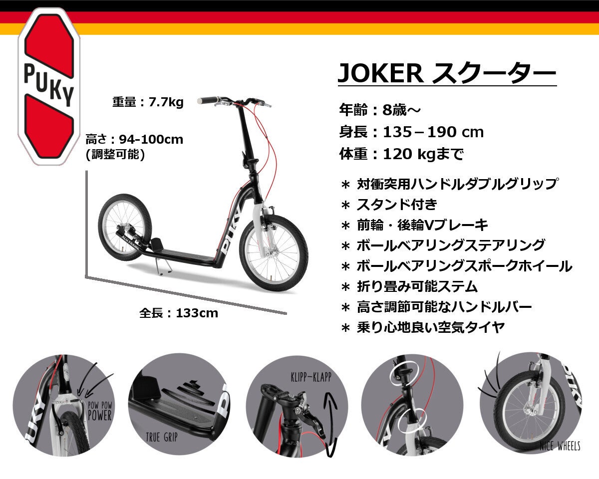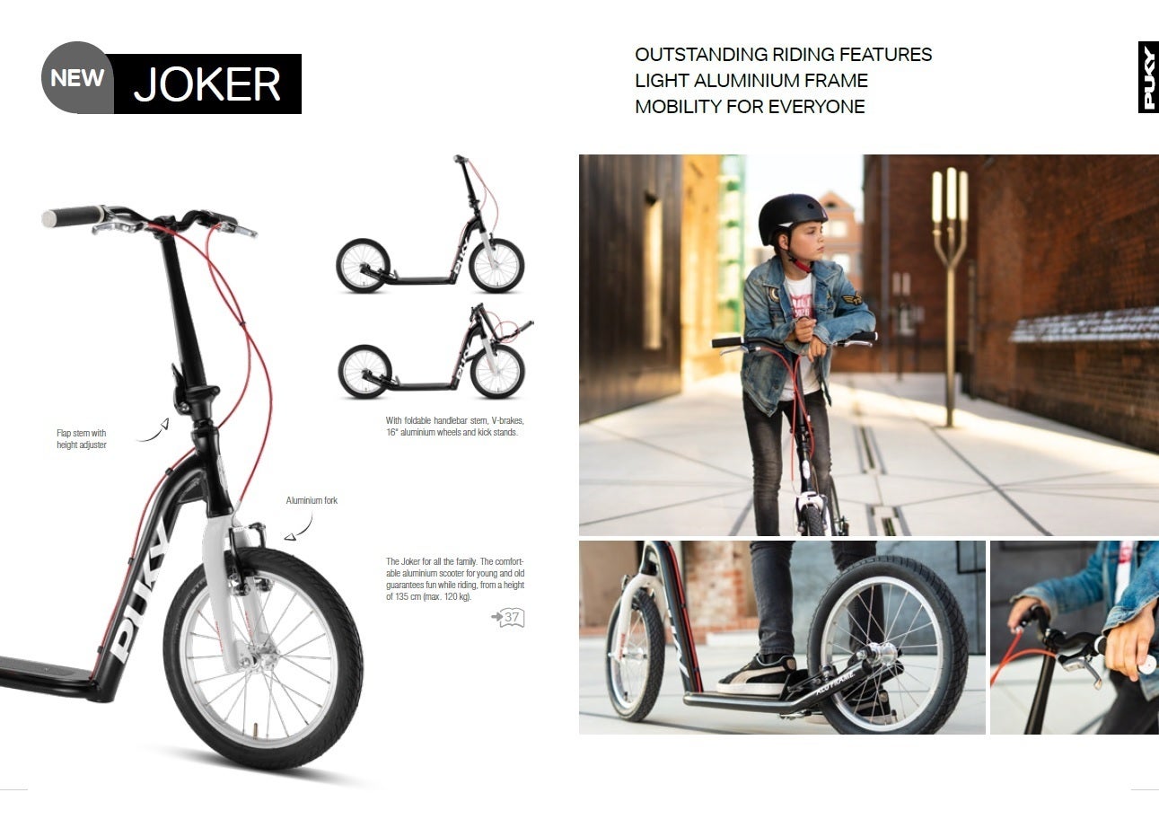 Jokerスクーターは家族みんなで使えるスクーターです。対象年齢は8歳からですが、対象の身長・体重はそれぞれ190cm・120kgまでと、大人も乗る事が出来ます。16インチのアルミニウムホイールを備えており路上の小さな障害物なら難なく乗り越えられます。ボールベアリングのスポークホイールとステアリングでスムースなハンドル操作を可能にしています。Vブレーキも前輪と後輪についており急なブレーキでも即座に速度を落とす事が出来ます。ハンドルの両端には二重のグリップが付いており転倒しても被害を最小限に防げます。ステムは折りたたむことが出来ますので持ち運びにも便利です。