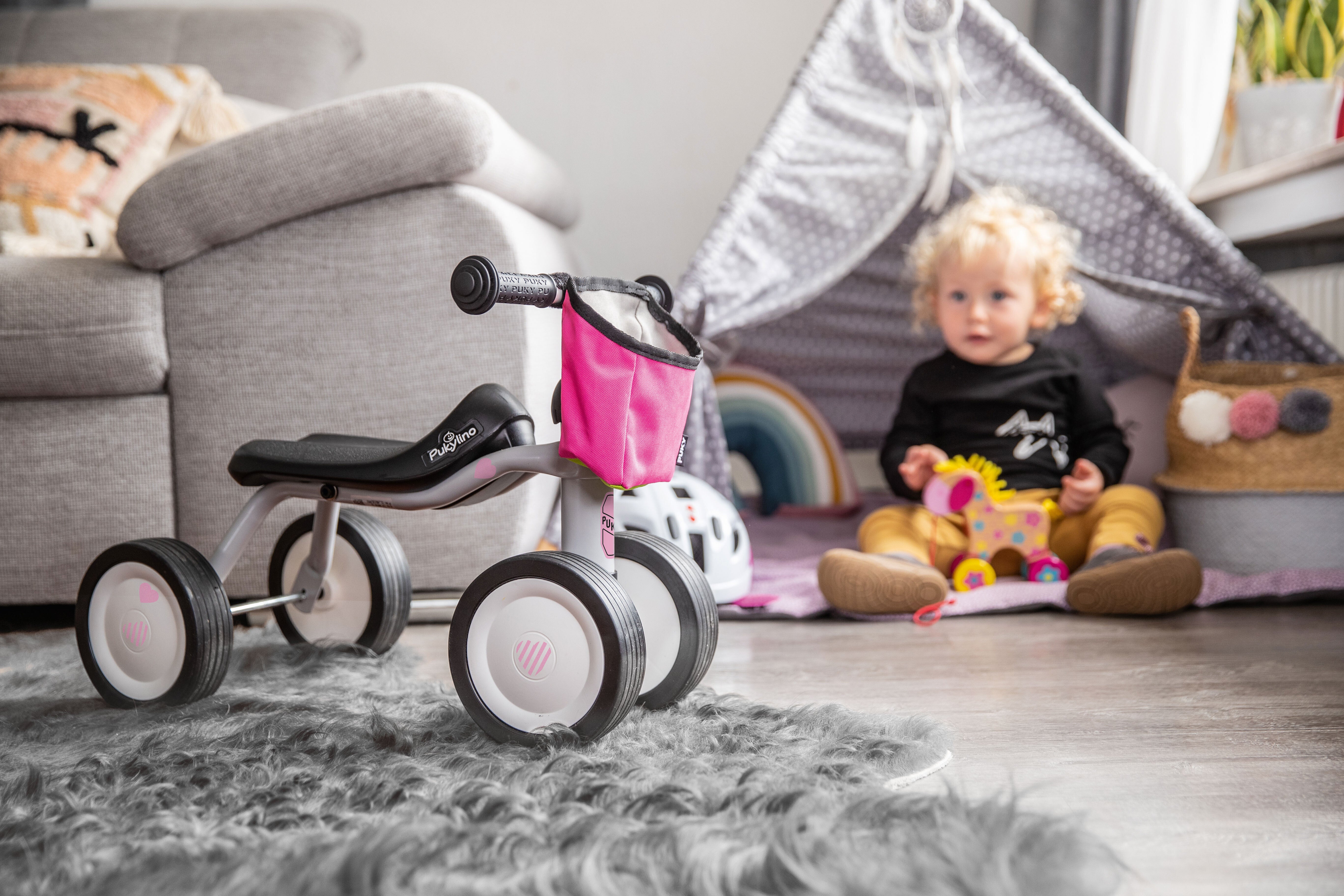 プッキーリノは座ったり歩いたりする事が出来るようになったお子様が直感的に乗って動かせて、結果的に運転能力や運動能力の向上に繋がる事を意識してデザインされており、お子様が一番最初に乗る乗り物になる事が出来ます。前輪後輪にしっかりした車軸が付いているので高い安定性を誇り、お子様が1歳から乗って運動の練習が出来ます。Pukyの長年の研究開発により子供に優しく乗りやすい上に安全性を最大限まで高める事が出来ました。このプッキーリノはお子様が乗ったり下りたり、押したりハンドルを切ったりする最初の経験となる事間違いありません。お子様の行動範囲を広げ、自分でハンドルを切る事によって自らの意思で物と自分の進む方向を変える事が出来るという事を学べます。なお、こちらのプッキーリノは屋内での使用となります。