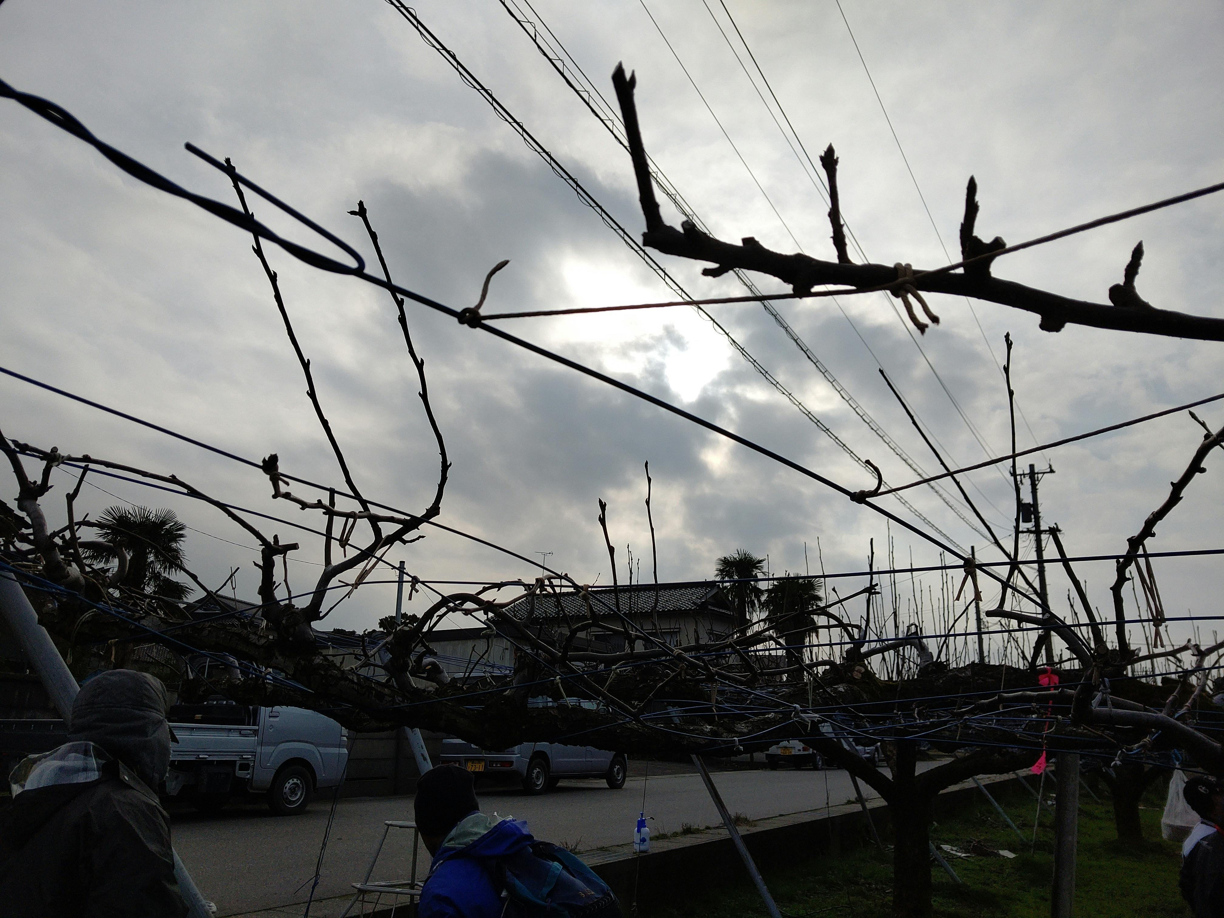 「誘引」、写真にある針金みたいな線(棚線=たなせん)に枝を引き寄せて紐で縛る、という作業です。枝や葉の重なりを防ぎ、さらに縛ることで作業がしやすい(誘引しないと枝が高いところは手が届かなくなり難儀する)など樹の養分や作業する人のことも考えた作業です。