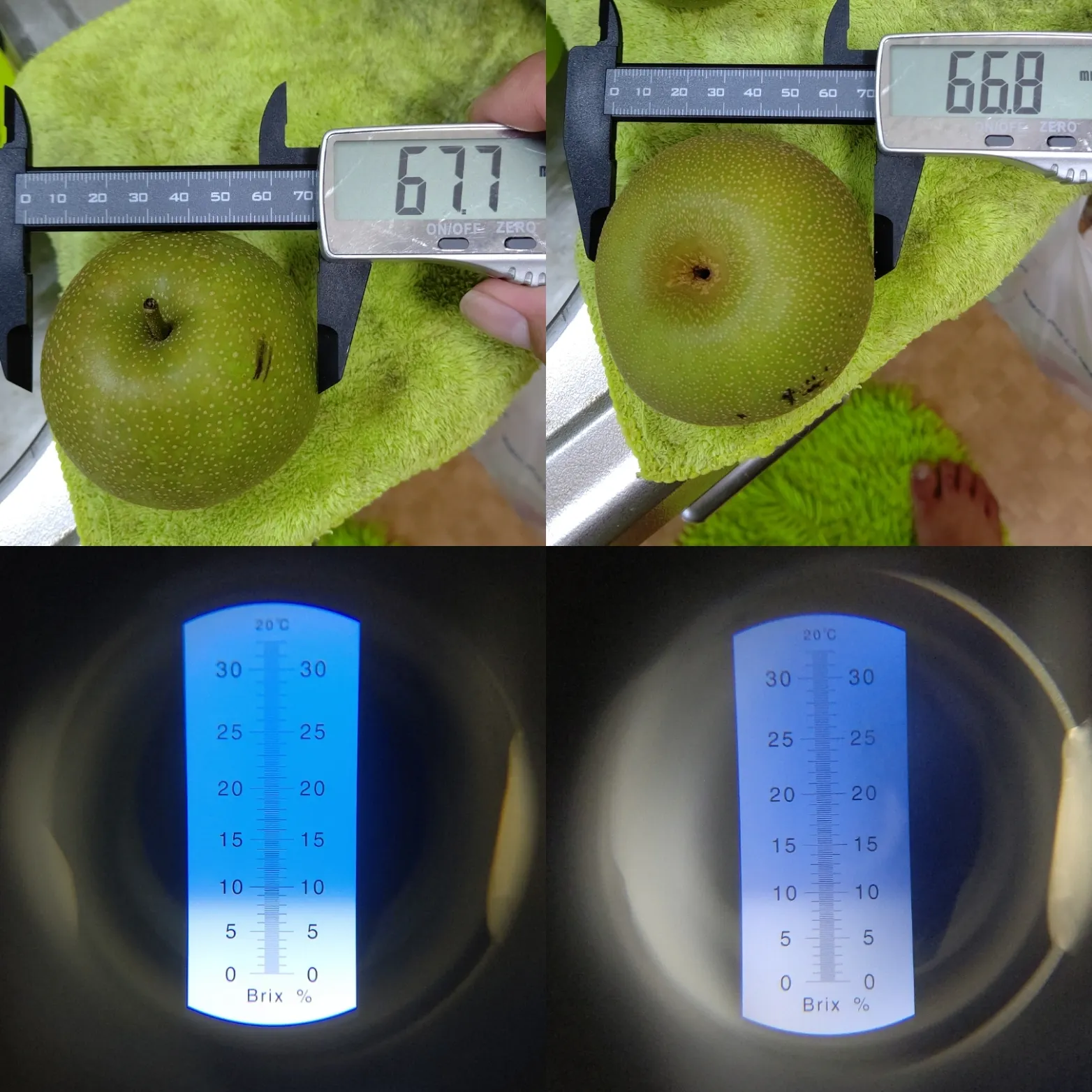 実際の味は、まあ甘くないですね。デカいだけです。シャリシャリ感とみずみずしさはあります。糖度は8~10度、目安は13度前後。数字の単位は㎜(ミリメートル)です。