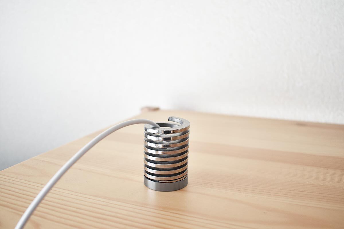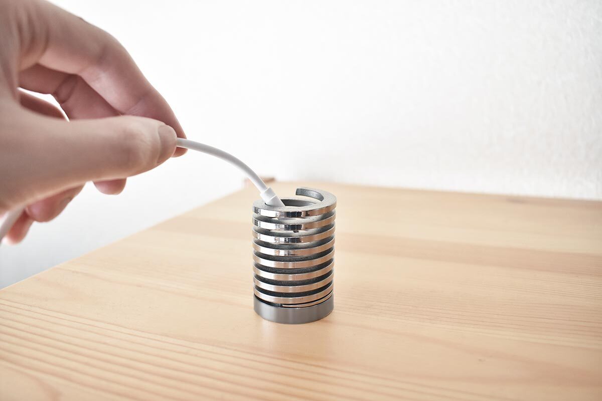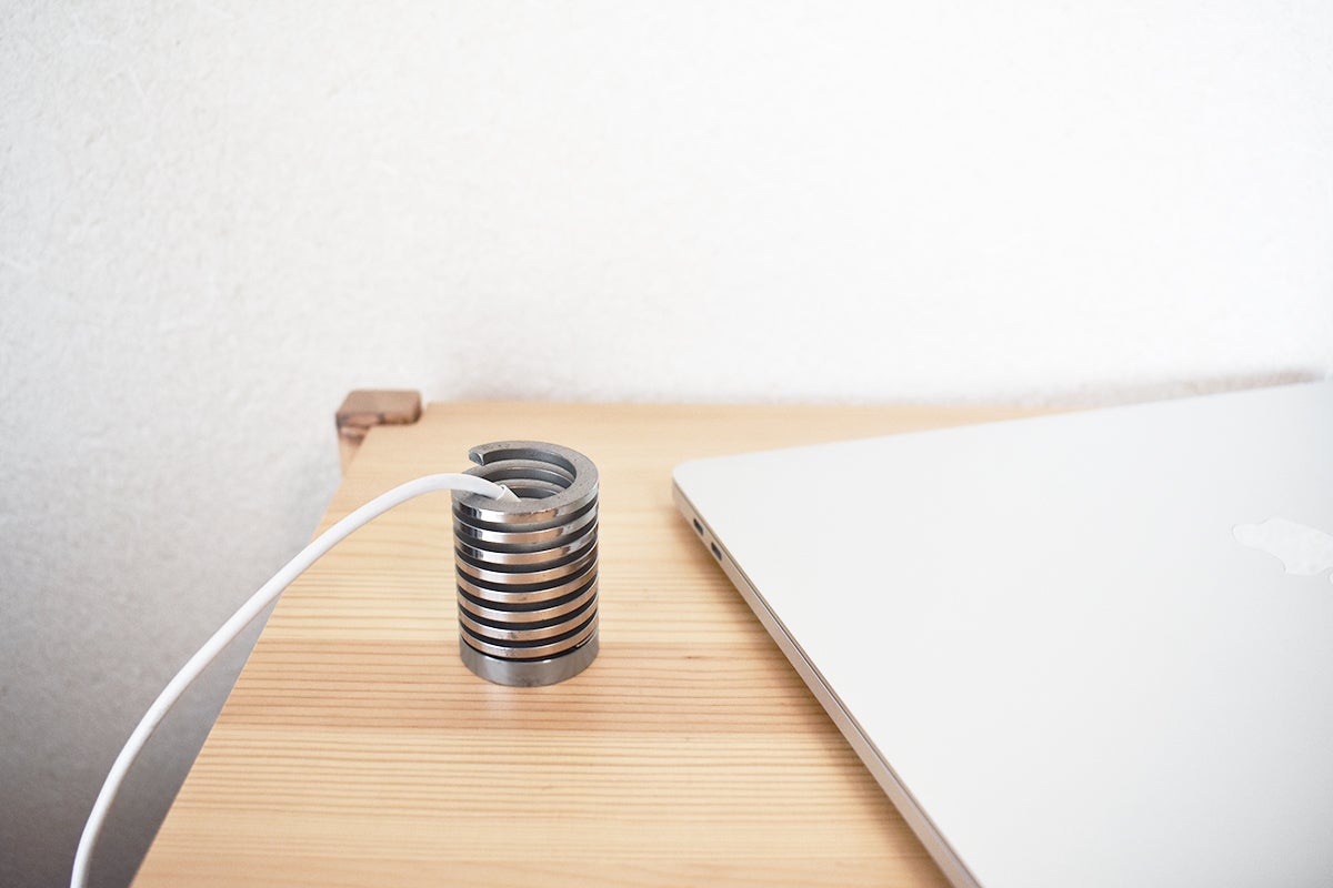 ばねの隙間と、重さによって簡単にケーブルを固定できる機能性と、デザイン雑貨でグッドデザイン賞の受賞歴もあるばねの美しさを両立させた、機能美が最大の特徴です。