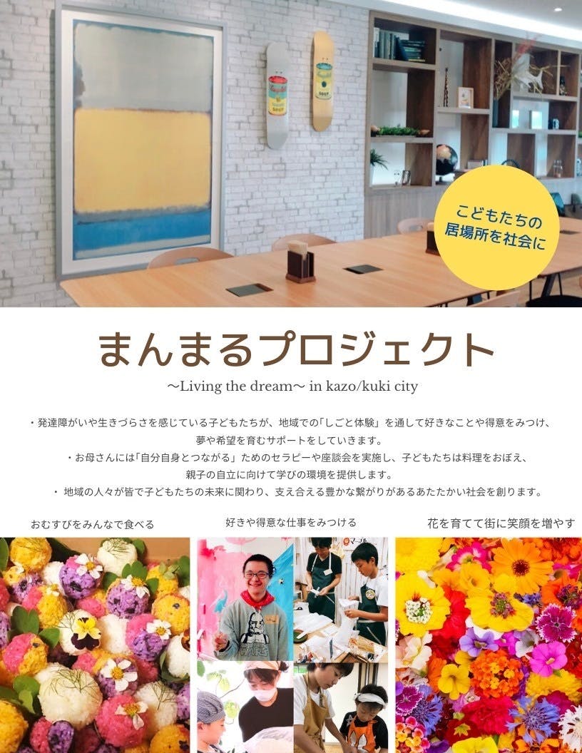 こどもたちが気軽に集うことができる、学校ではない、特別な居場所(安心の中で学びが得られるような環境)を用意します。仕事前のミーティングや、交流イベント、学習支援や保護者の相談会など、まんまるプロジェクトの拠点となります。(埼玉県加須市。最寄り駅は栗橋駅)