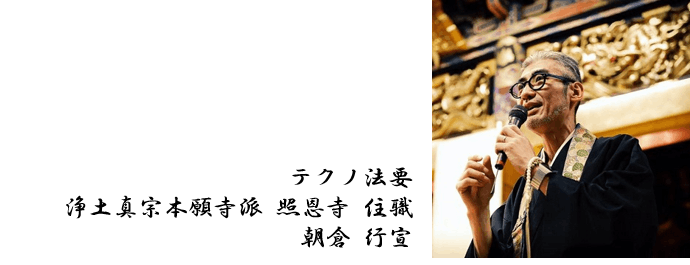 「テクノ法要」では、「極楽浄土は光の世界」という認識を基に、空間(寺の内陣に限らず、ホールや野外なども含む)を現代の光(プロジェクタ投影・舞台照明)で装飾し、昔から伝わる声明(お経など)を時空を超えるテクノサウンドにアレンジしてお勤めを行います。阿弥陀という言葉は、「空間と時間に限りが無い」という意味で、今風には「時空を超えた世界」と表現できるでしょう。