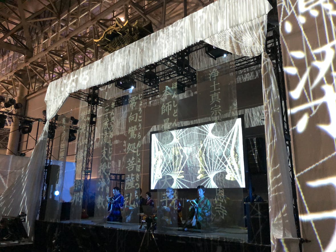 この事実を元にして、現代に生きるわたしが現代のテクノロジーを駆使し、そしてDJとしての経験を活かして考えた現代の法要が「テクノ法要」です。プロジェクションマッピングで寺院を彩り、テクノ音楽にのせて読経を行う法要で、2016年に照恩寺で実施して以降、多くのメディアで取り上げられました。