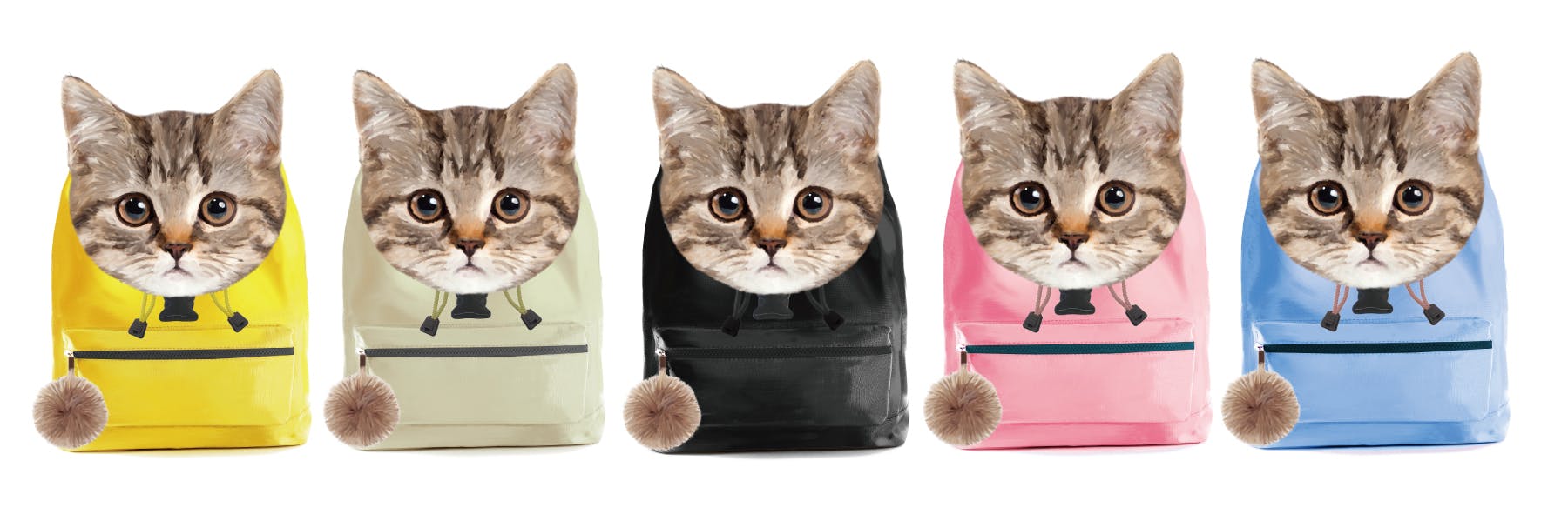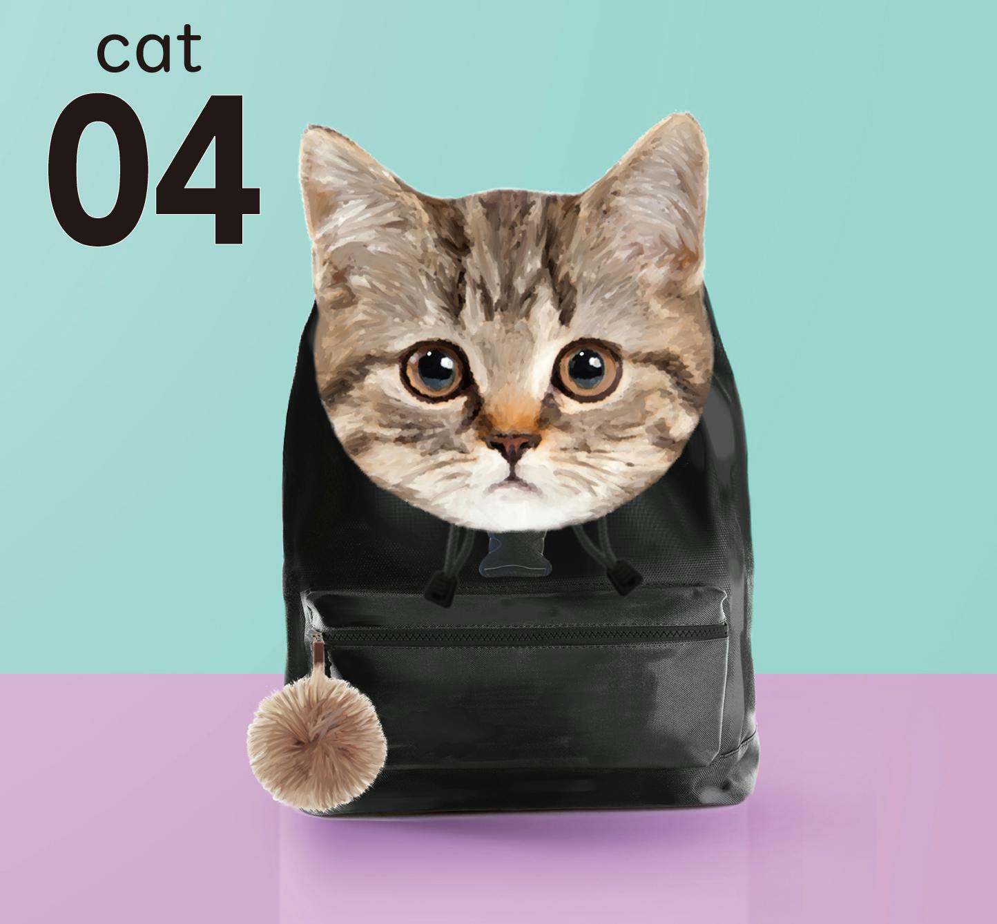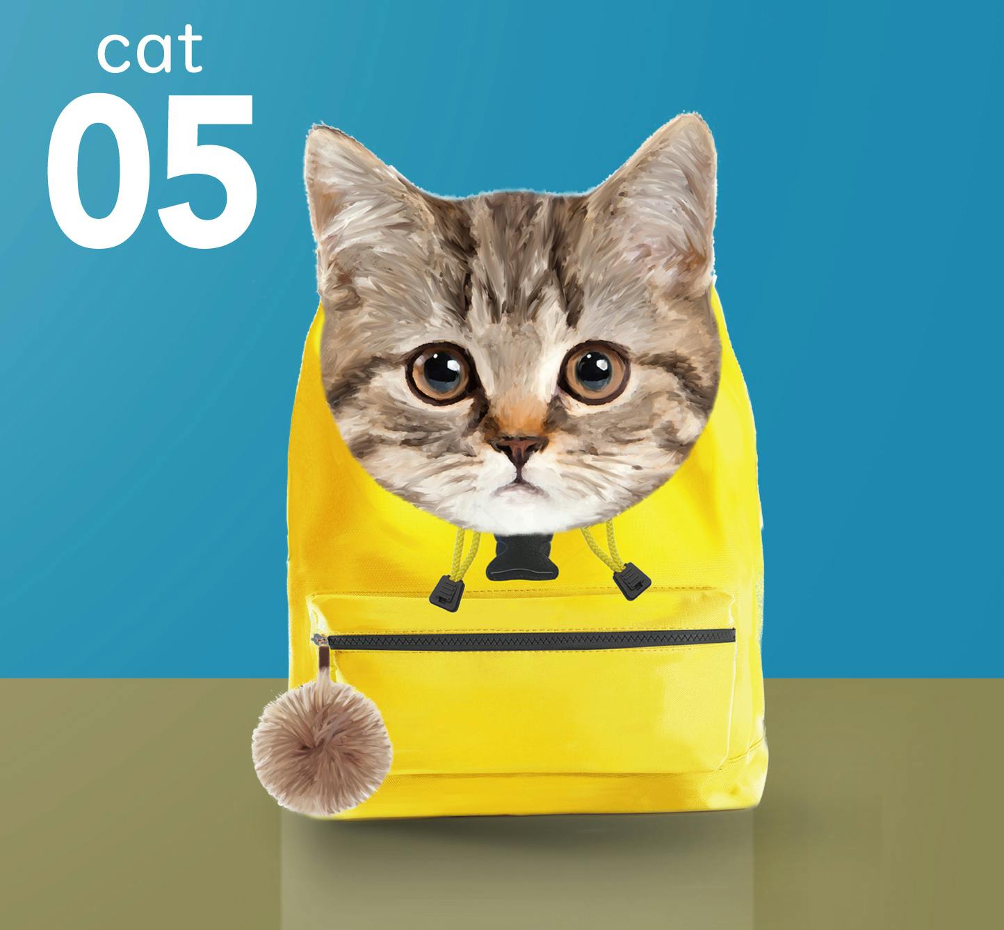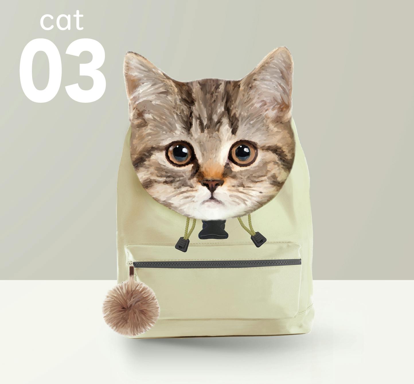 トップポケット(雨蓋)が猫の顔になっており、素材は起毛フェルトでふわふわとした触り心地になっています。本体は軽く丈夫なポリエステル素材を、本体背中部分は通気性の高いメッシュ素材を使用します。本体正面のポケットはファスナー付きで小物入れに便利です。またファスナーにはポンポンがついていて、これは猫の色に合わせたカラーで配置します。