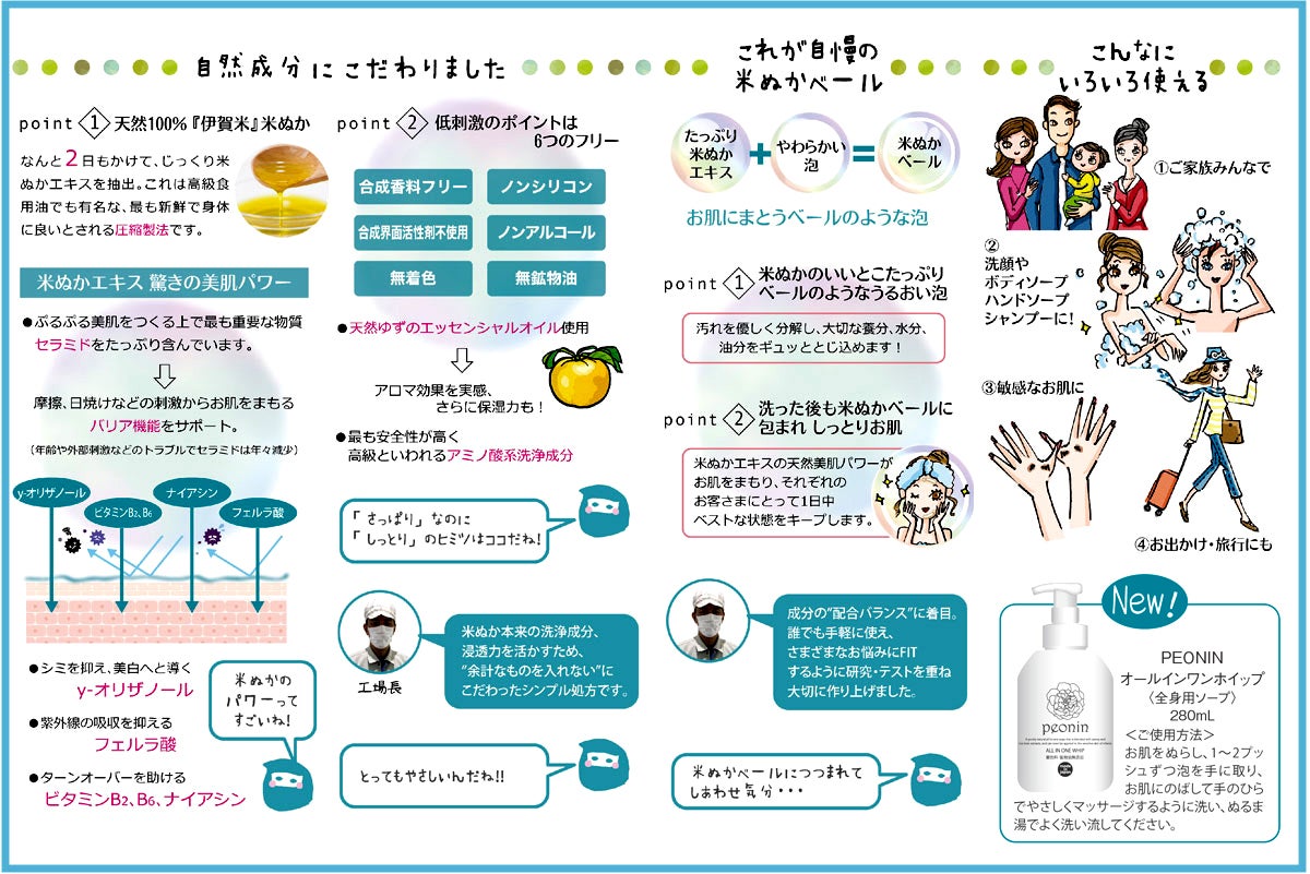 ジェルをご使用頂いた方々から「今度は洗顔が欲しい!」などの声を多数いただき、同じく伊賀米米ぬかエキスをたっぷり使用した泡で出てきて全身洗える、オールインワンホイップを開発。