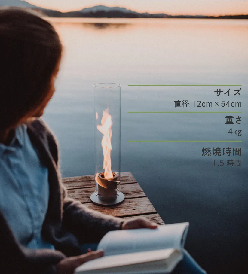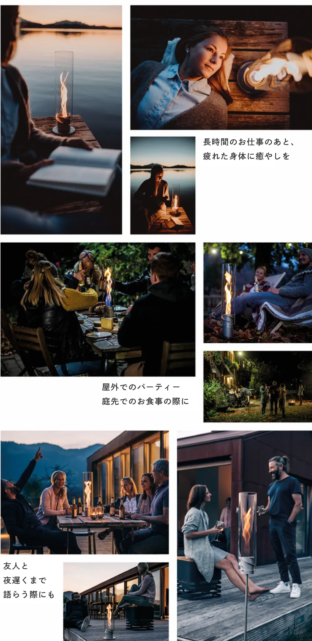 「炎」という存在以上に我々を魅了して、おだやかな気持ちにさせてくれるものはありません。火や炎を眺めることで、筋肉が弛緩し、血圧を下げ、幸福な気分になったり、気持ちが社交的になったり、といった影響が得られるとも言われています。