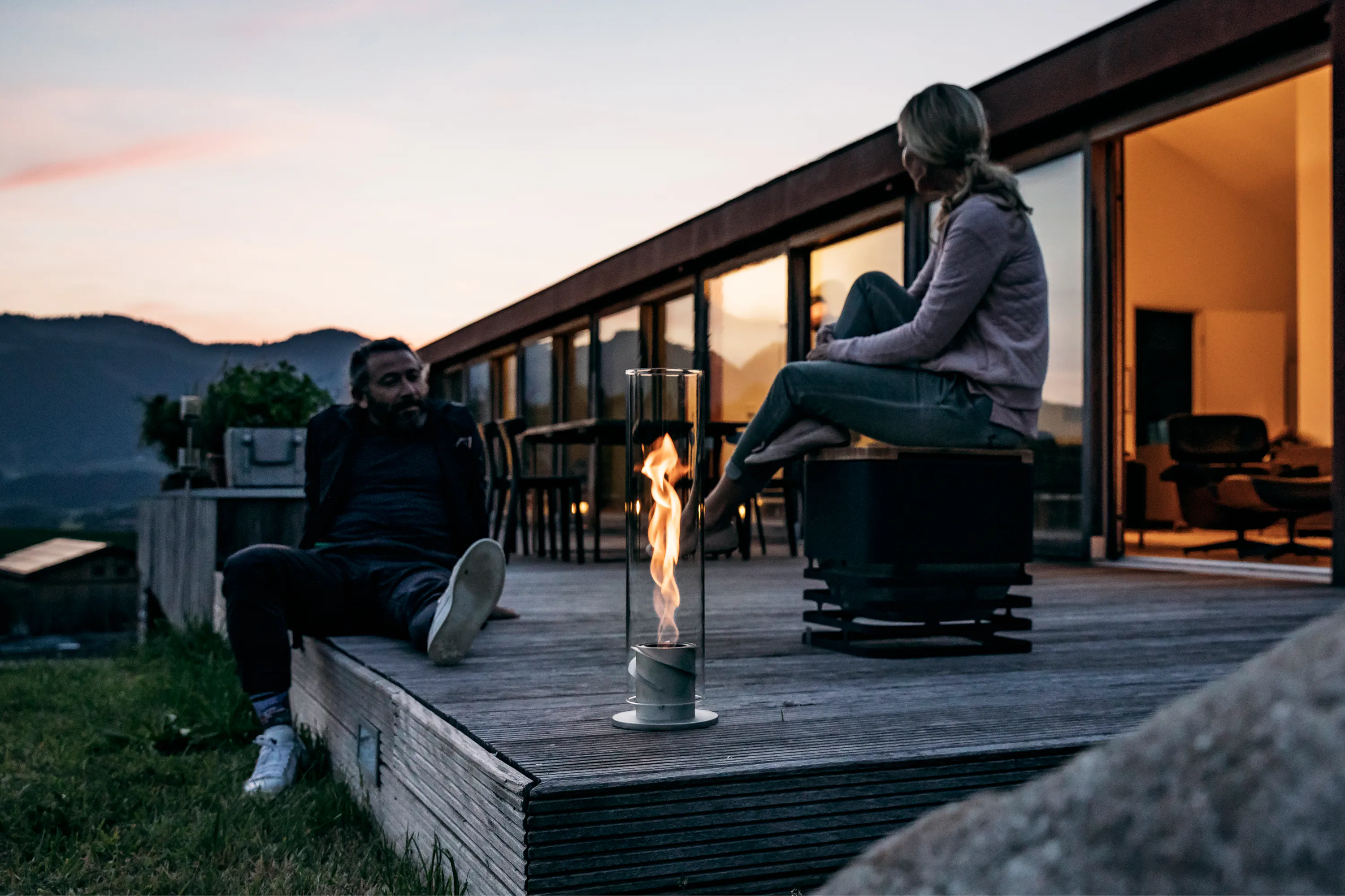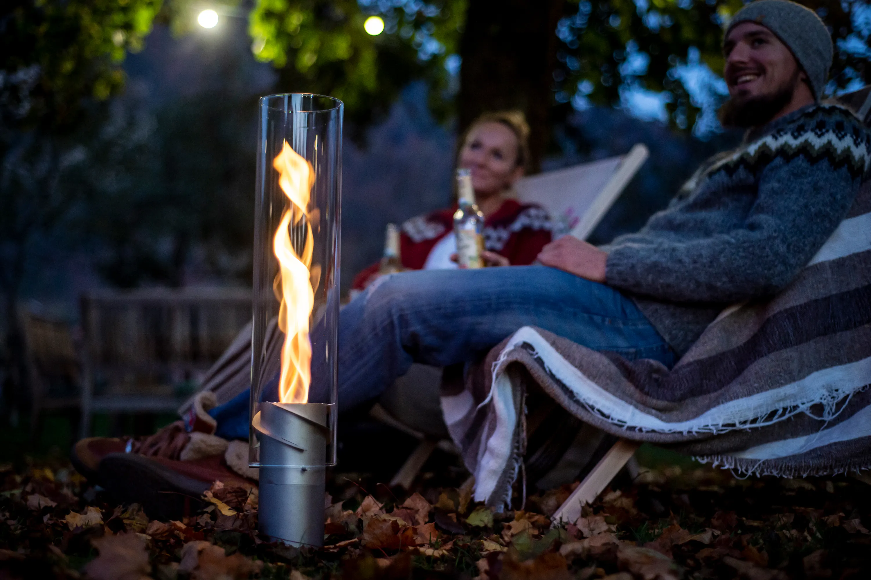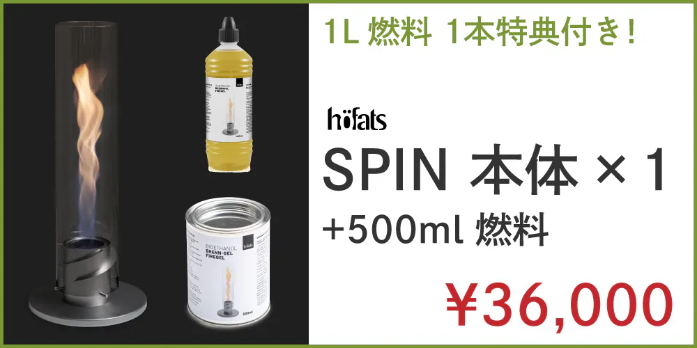 「SPIN」は、装飾的なガラス製シリンダー内で渦を巻く炎が印象的な、屋外で使用可能なアウトドアランタンです。燃料のバイオエタノールは燃やすと水蒸気のみが発生する安全仕様。