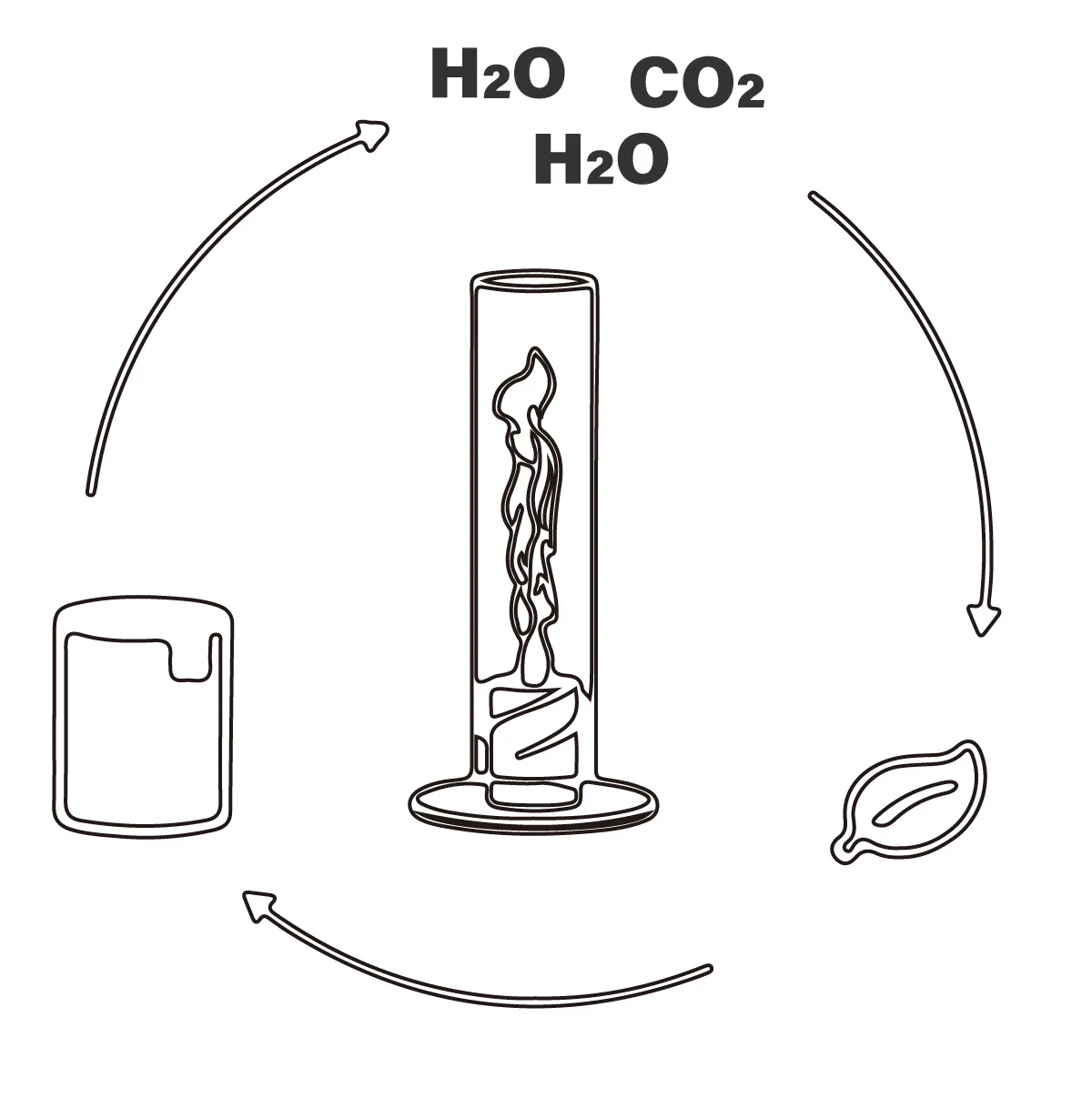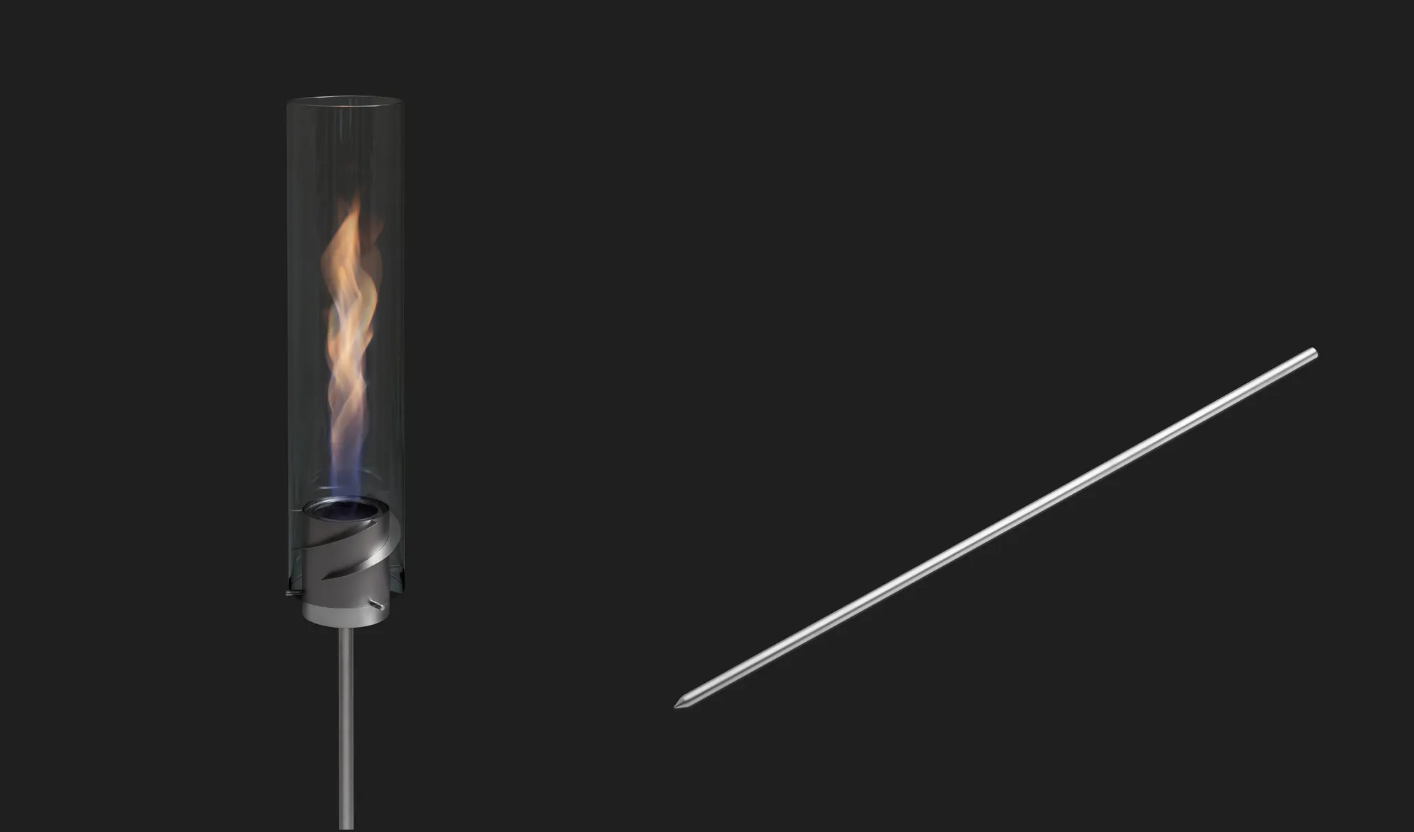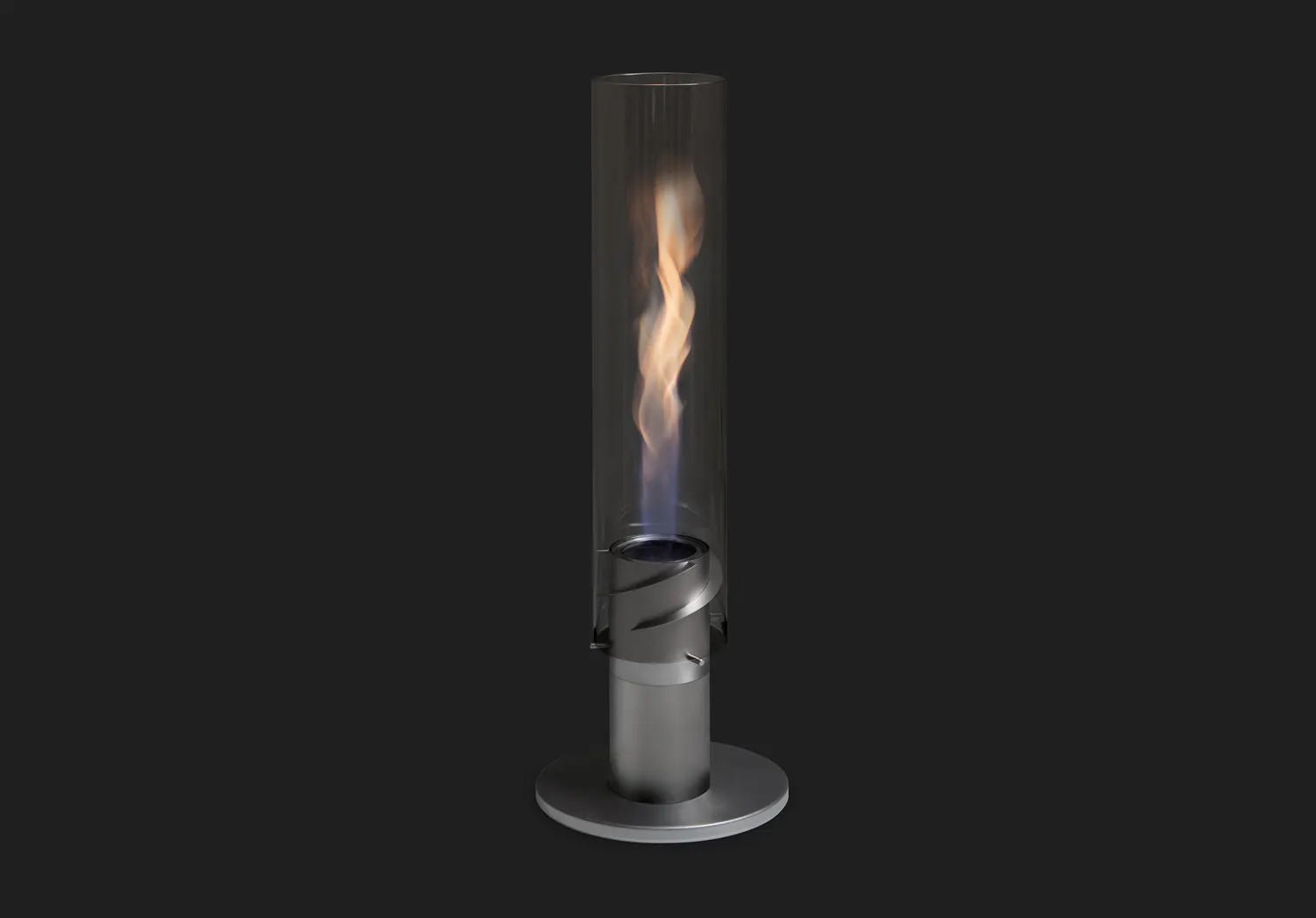 3つのガイドプレートは気流の流れを回転させるように設計されていて、燃える火の熱により空気が加速し、ガラス製シリンダーが煙突効果を発生させ炎が渦を巻きながら上昇するのです。