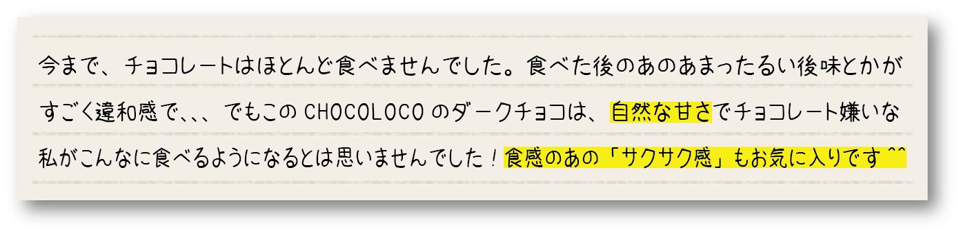 しかしこのCHOCOLOCOのチョコレートフードは、とにかく美味しく、その上僕が目指していた無添加で安全で、なおかつ普段から日常で食べれるお菓子的な要素を全て満たしていたんです!それが繋がった瞬間、「これだ!これなら僕の周りのおじいちゃんおばあちゃんに、『食べて美味しい、そして健康に!』を伝えることができる。」そんな思いでいっぱいになりました。
