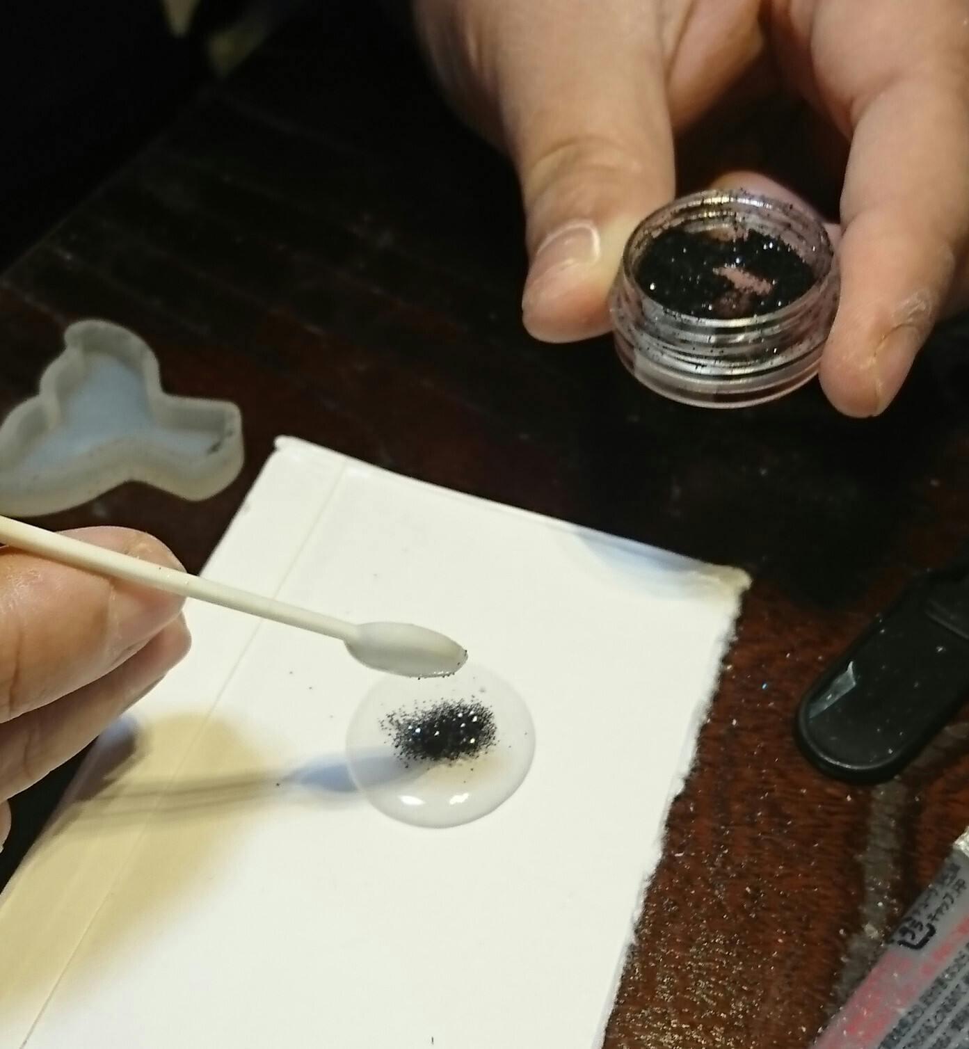 ②シリコンモールドに色づけしたレジン液を流しこみ固める
