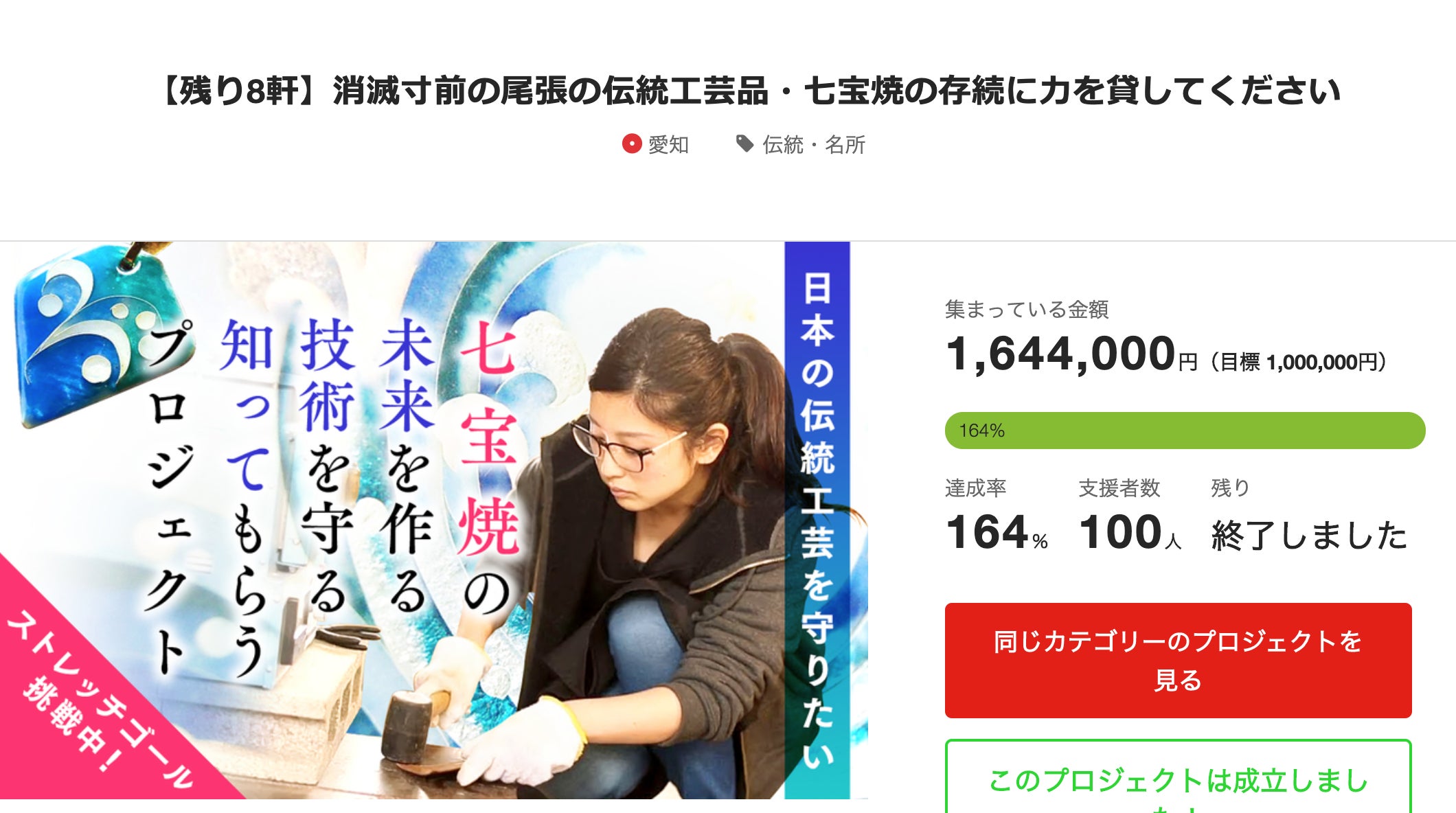 七宝焼を知っていただくための動画制作をテーマに実施し164%で達成。