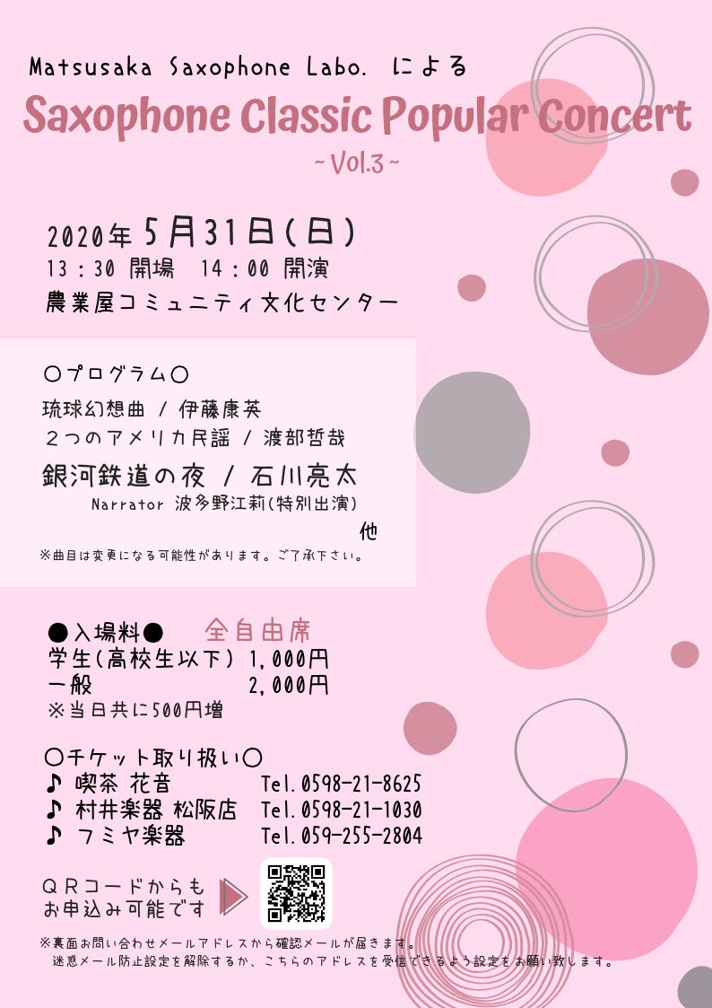 初めての市外での演奏会を岐阜県岐阜市にて企画。Matsusaka Saxophone Labo.によるSaxophone Classic Popular Concert~岐阜公演~を岐阜市文化センター小劇場にて開催予定。