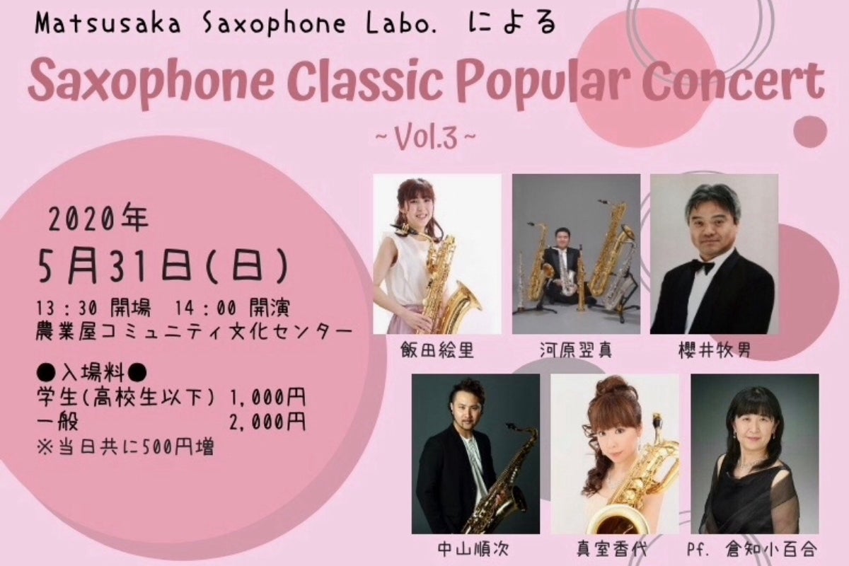Matsusaka Saxophone Labo.によるSaxophone Classic Popular Concert ~Vol.3~を農業屋コミュニティ文化センターにて開催予定。