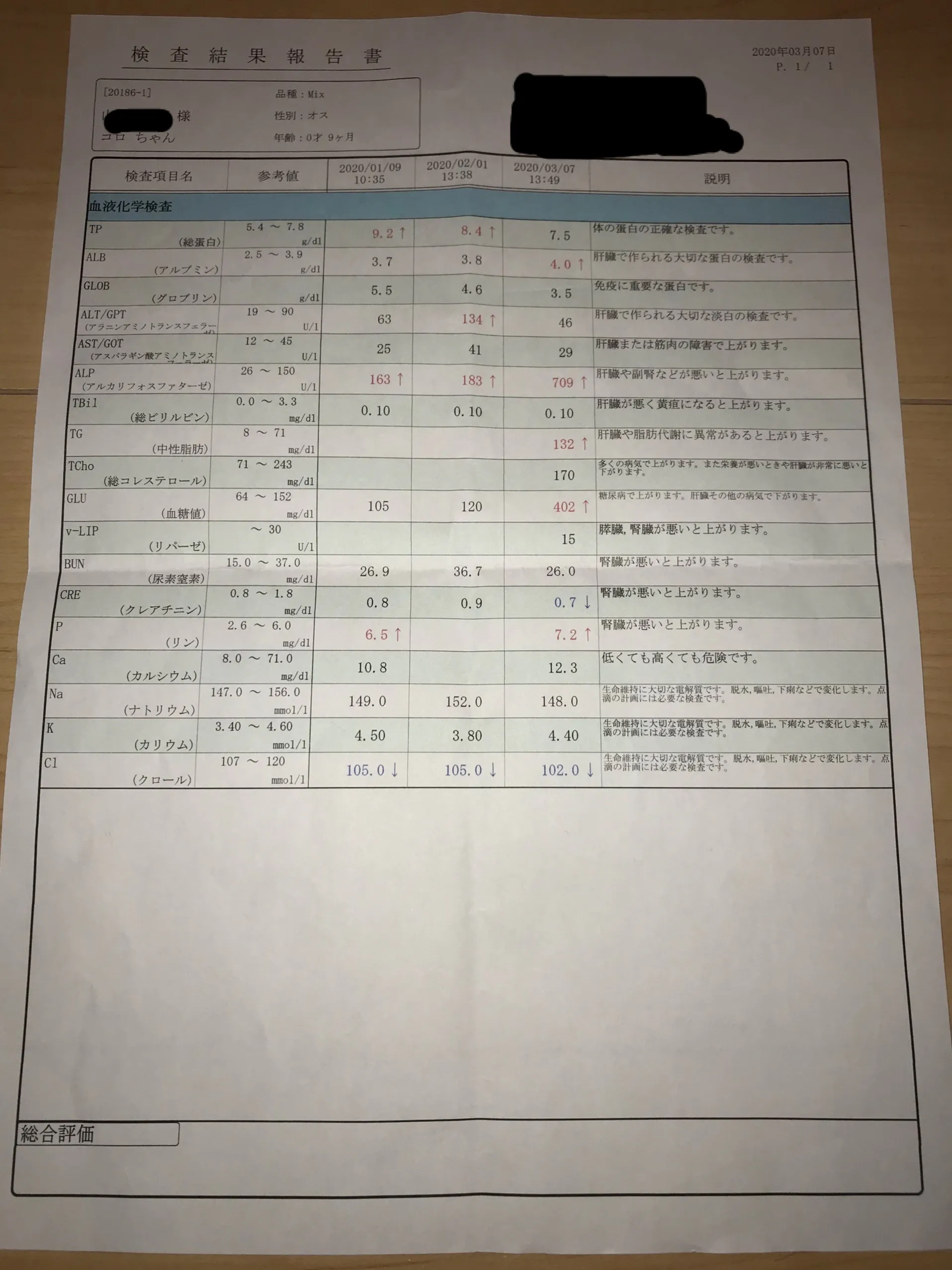 2020/03/08 20:16お久しぶりです!昨日、かかりつけの動物病院で血液検査を実施しましたのでご報告させて頂きます。mutianを中断してから、かわりにステロイドの投薬してきたところ驚くべきはどの回復を見せてくれました!!!主治医も驚くほどの数値回復で、もう普通の猫になっちゃったと言って頂けるほどです。添付の写真が今までの血液検査の数値がわかる一覧表になります。ステロイドのせいで肝臓の数値が非常に悪いので、今後は薬の量を調整できないか来週の診断で先生に聞いてみようと思います。また来週にご報告させて頂きます。皆様のご支援、応援のお陰でここまでこれました。本当に感謝申し上げます!! もっと見るFIPではないことが新しい病院で告げられました