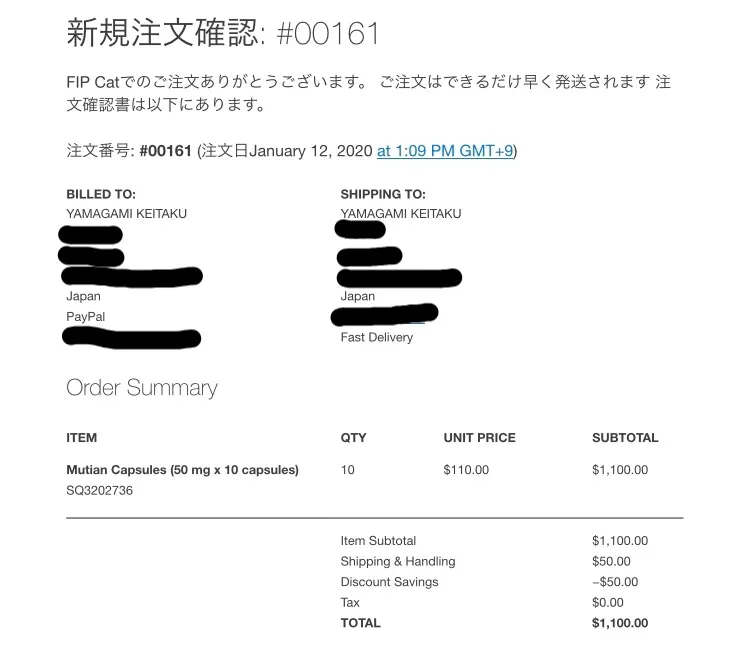 こんにちは。当初は資金難からクラウドファンディングが終了してからのMUTIAN購入を考えていたのですが、獣医師さんから極力早く投薬を開始した方が良いとのアドバイスを頂き、何とか資金を工面して至急FIP CATで購入することになりました。領収書を添付させて頂きます。クラウドファンディングでいくら支援して頂けるかわからない不安な中での開始となってしまいましたが、何とかコロを助けたい一心で購入に踏み切りました。写真が1枚しかアップロードできなかったのですが、実際には添付領収書の50mgx100錠($1,100)と200mgx20錠($880)の合計$1,980=約22万円を購入しました。これでもおおよそ1ヶ月分の投薬量です。次の投稿でコロの写真と状況もアップロードさせて頂きます。