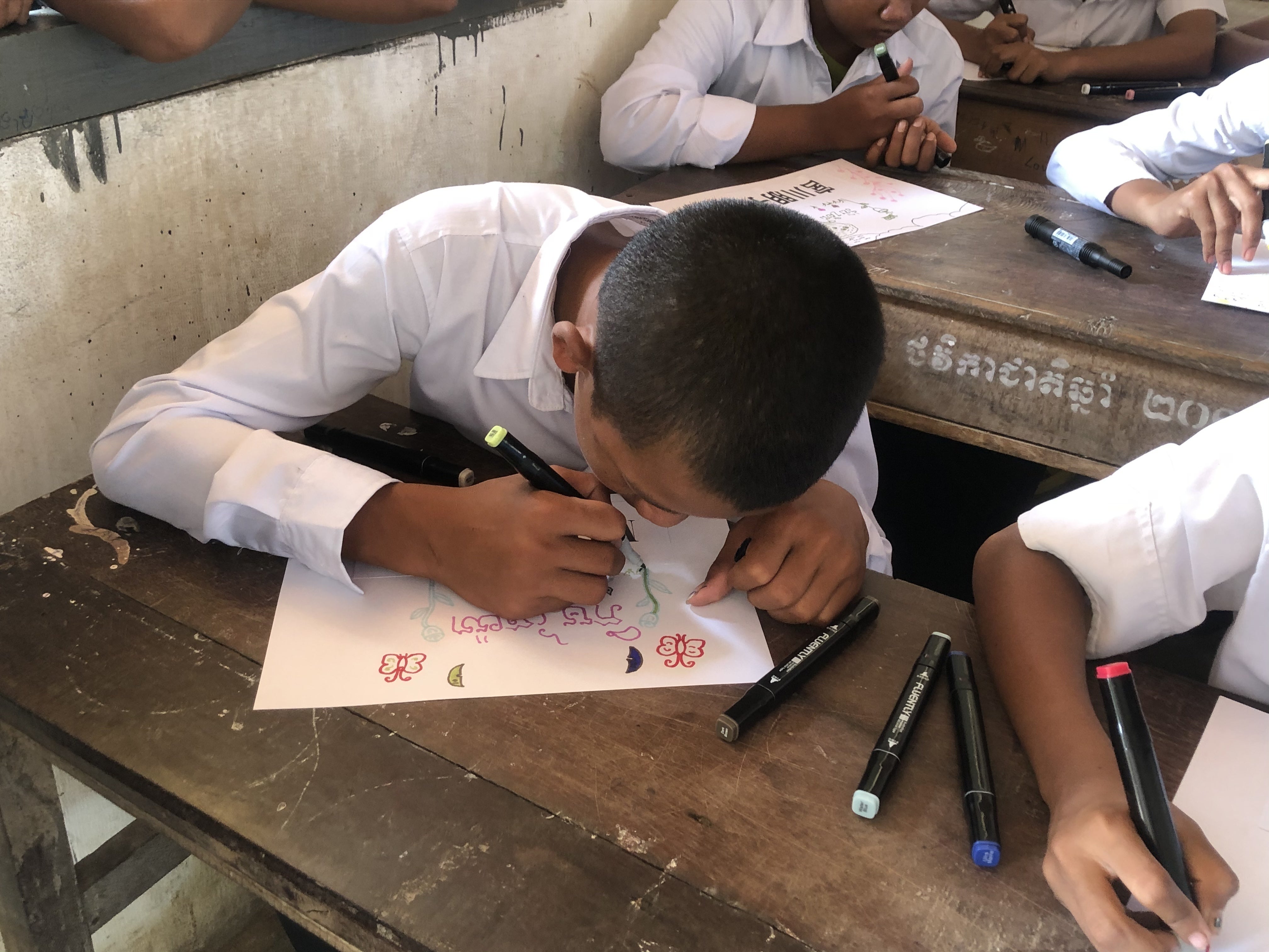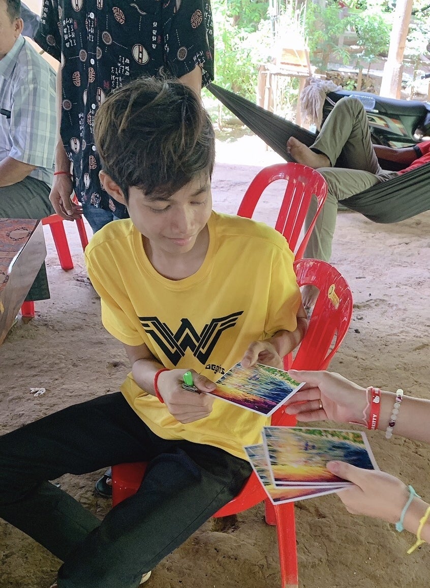 10月に1人でカンボジアへ向かいました。現地の方とアポをとって、みんなで里親に送る写真で 手に持つネームカードを作りました。