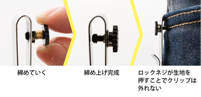 ネジの先端がポケットへりに内蔵しているテープ下端(下のステッチ)より下にあたるようになっています。ここを抑え込むことでクリップは外れず、安定します。