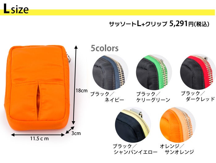 Lサイズ:横115㎜×たて180㎜×マチ30㎜ 重量90g 内ポケット×1 外ポケット×1