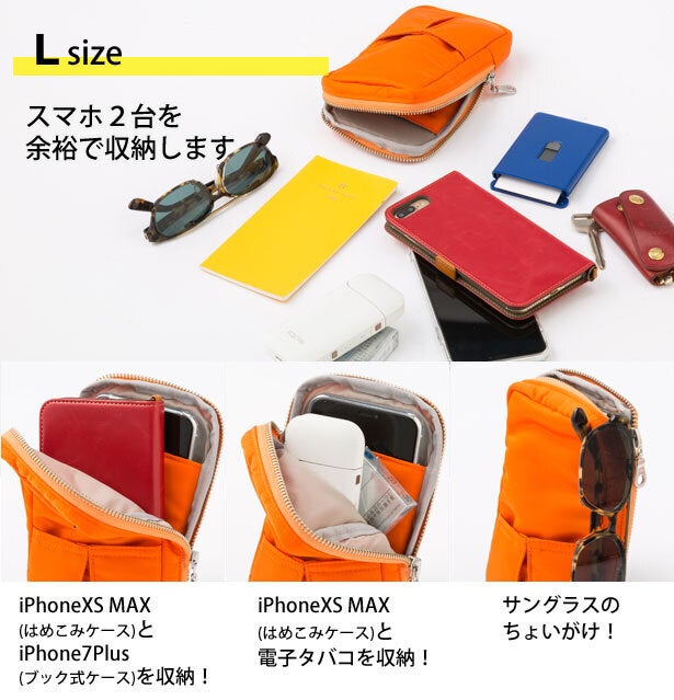 Lサイズは、大型のスマホを余裕で収納~バツグンの収納力ですのでスマホ+αを入れたいヒト向きの汎用性高いモデルです。ブック式のカバーケースをお使いの方は、こちらLサイズをお薦めします。