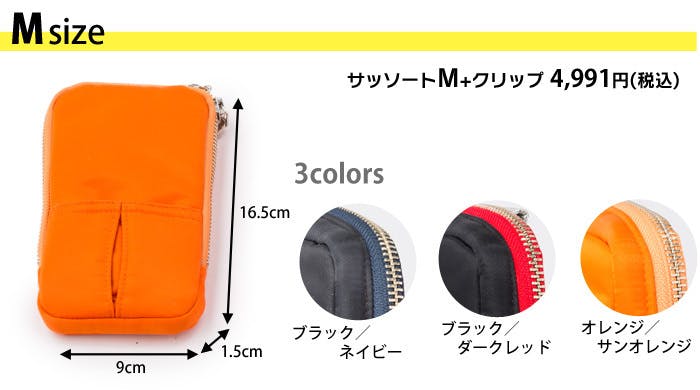 Mサイズ:横90㎜×たて165㎜×マチ15㎜ 重量75g 外ポケット×1