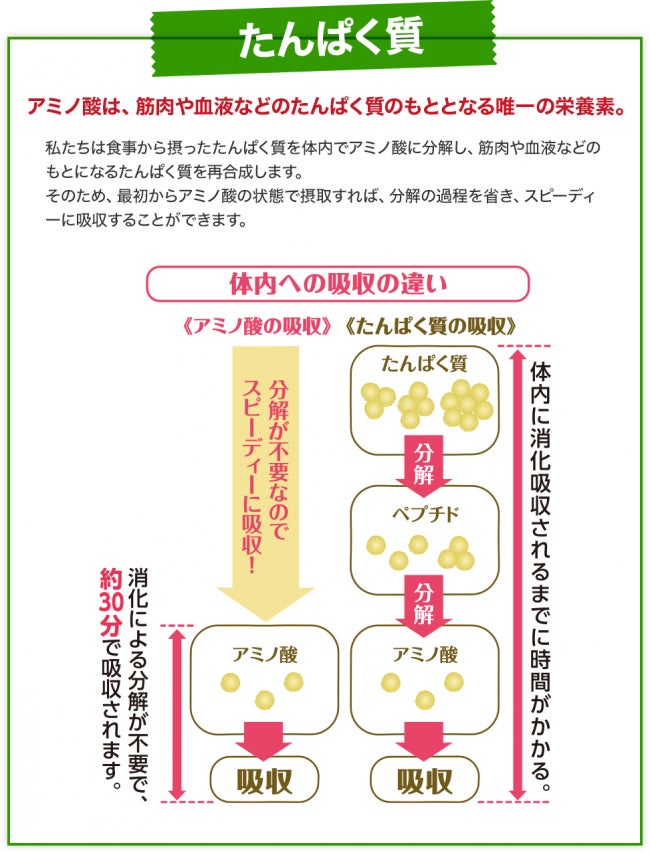 EAAは既に分解された状態で摂取できるため、消化のプロセスをスキップすることができ、即吸収ができる優れものなのです。