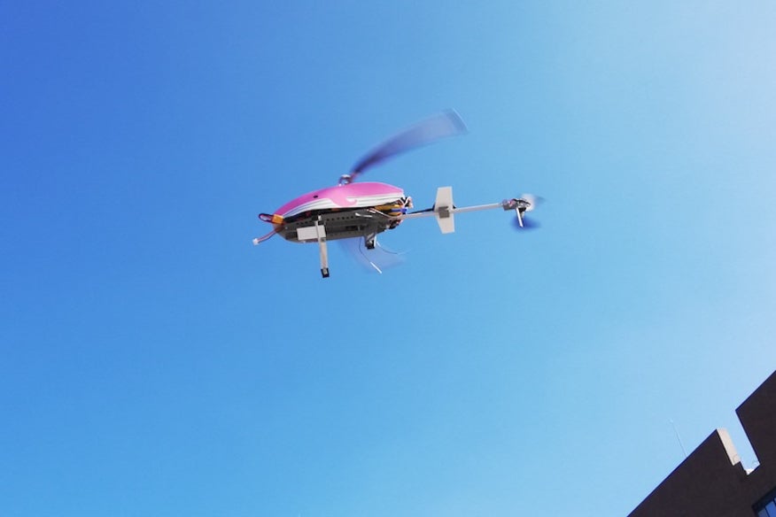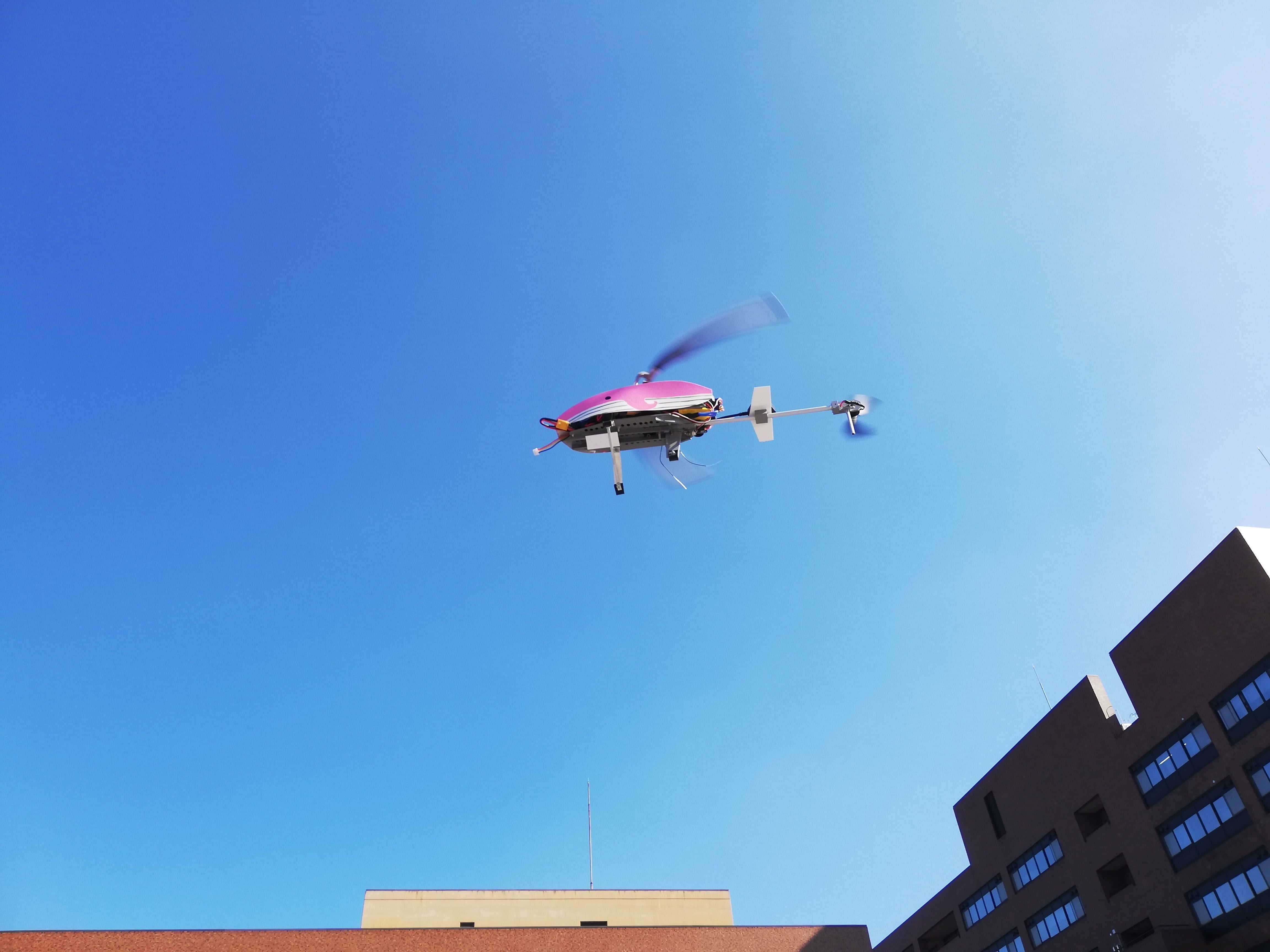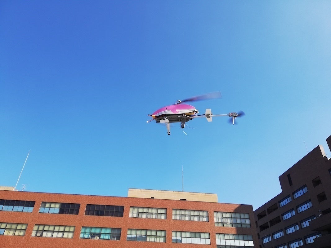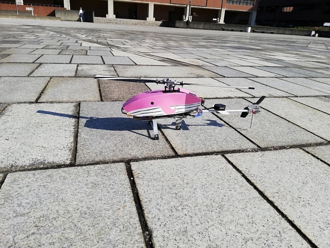 だいぶ身近になってきたドローンですが、日本の山岳地帯や海岸などの過酷な環境で実用されている機体はまだありません。そのような環境で飛べる機体を開発したいと思い、学術的視点から研究したところ、ヘリコプター型が適しているのではないかという着想を得て、機体を1から開発しました。現在すでに、飛行試験を行なっています。実際に飛行しているところをご覧ください。