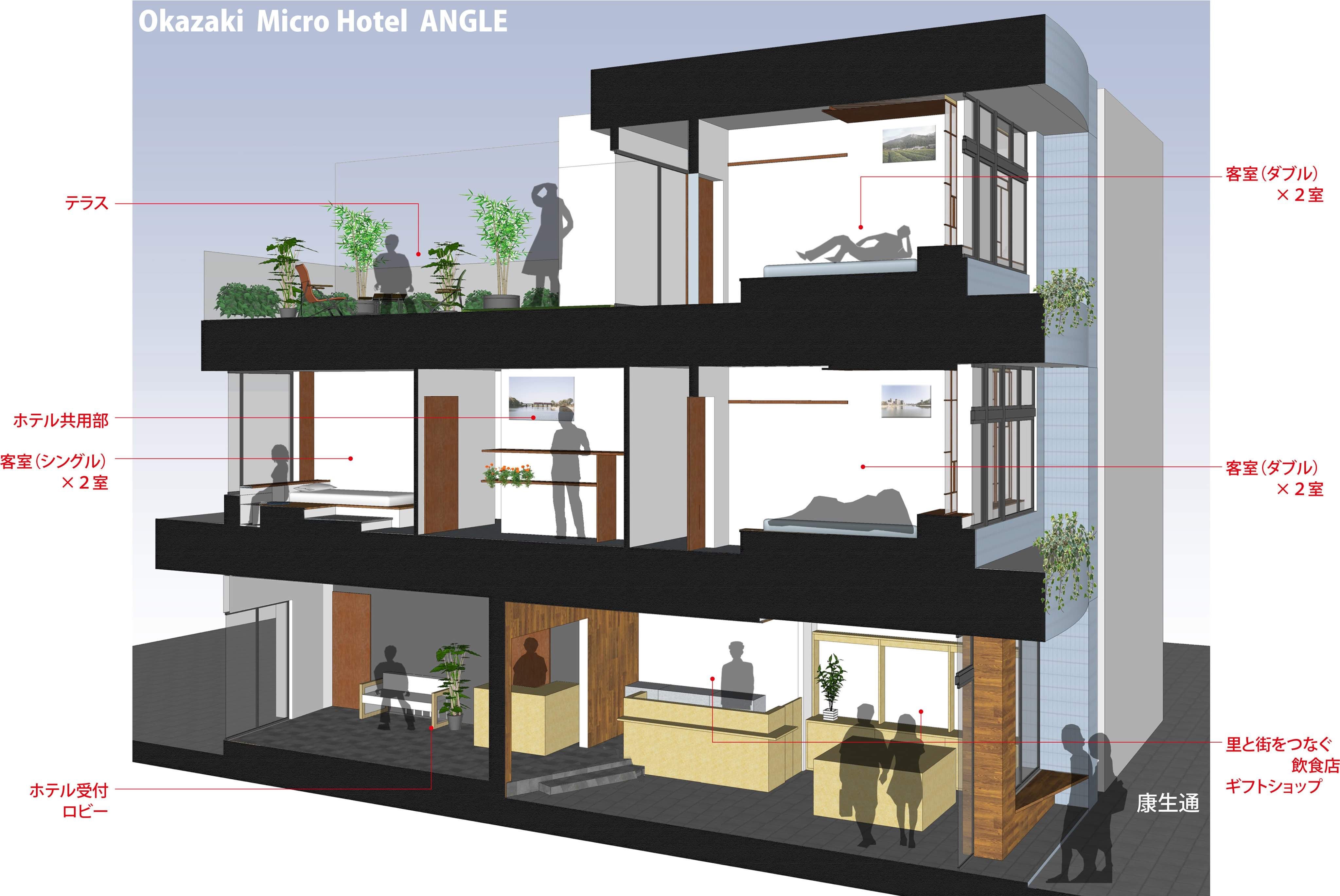 クラウドファンディングも残り15日と、日に日に終了まで迫ってきました。現在の状況ですが、支援金額は、1,780,000円を超え、目標金額達成率が89%。支援いただいている人数も168名。多くの皆さまにご支援いただき、本当に日々、感謝でいっぱいです。挑戦中はお名前等が分からなく、すぐにでもご連絡したいのですが、お礼はクラウドファンディングが終わり次第、一つ一つ思いを込めてやらせていただきます。そして、本日2/24(月)は、地域の方向けの説明会を実施し、自分が思っていることなどをしっかりとお伝えさせていただいています。また、施工も明日から本格的に業者が入り、工事を進めていく予定。今回の報告では、内装のイメージも公開させていただきます。<ホテルイメージ>ホテル全体像3階建てのビルで、以下それぞれ概要となっています。■概要1階:(手前)里と街をつなぐ飲食店、giftショップ、 (奥)ホテルフロント2階:シングル客室2部屋、ツイン客室2部屋、シャワー、トイレ、共用部3階:ツイン客室2部屋、屋上テラス正面入口入口は「里と街をつなげる」がテーマのテイクアウトもできる飲食スペースとギフトショップ。こちらは僕が運営ではなく、テナントさんが入る予定です。(また正式にお伝えします。)ここでは、宿泊者の方と地域の方が混ざり合えばと思っています。ツイン客室部屋は、シンプルで居心地が良く、段によって使い方がデザインされている空間です。マットレスは特注で、小上がりの木材は地元の製材会社のもの。部屋に置くスタンドライトも特注予定。5月末のグランドオープンに向けて着々と全力で前に進んでおります。ただ、建築費の予算はだいぶ厳しい状況なのが正直なところです。クラウドファンディングも佳境になってきておりますが、まだまだ多くの方のご協力、ご支援いただけると幸いです。引き続き、よろしくお願いします。