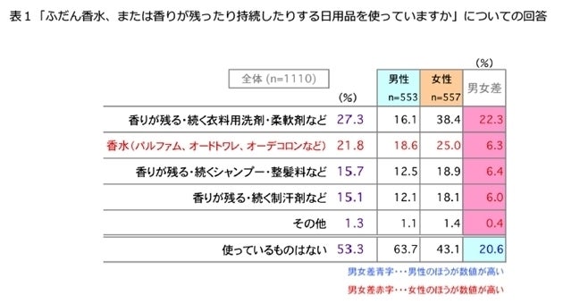 逆に香水も含めた香りが残ったり持続する日用品を「使っていない」割合は男性が63.7%、女性が43.1%となり、男女ともに香りに関する意識が<高いとは言えない>傾向にあります。