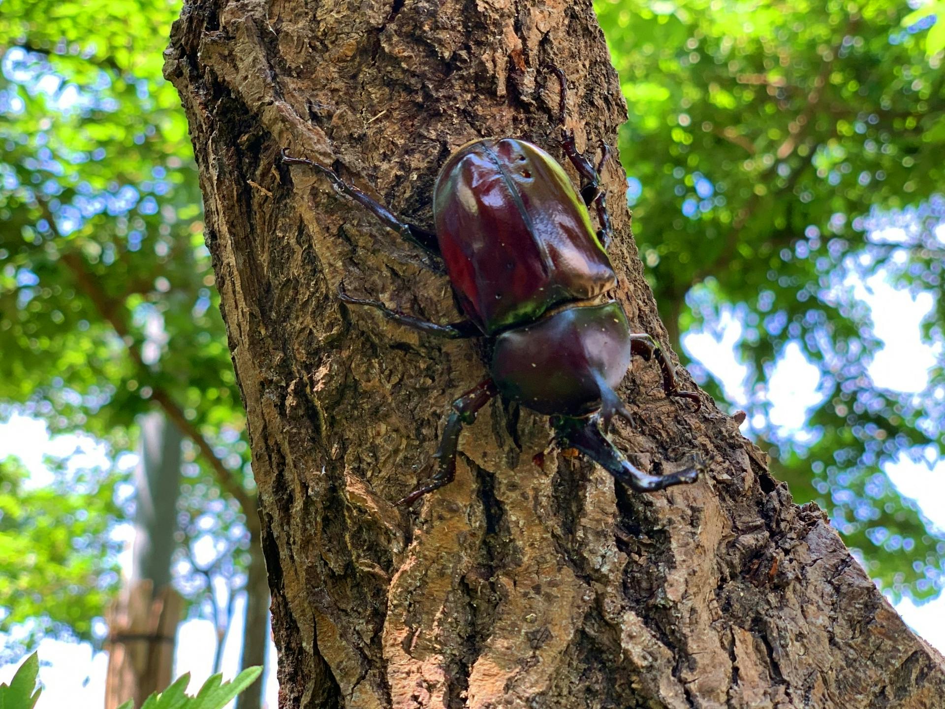 大型昆虫は、クヌギやコナラなどの広葉樹の生える雑木林に住んでいます。クヌギやコナラなどの木から出る甘い樹液は、大型昆虫の大好物です。樹液は、森の微生物によって発酵し、甘酸っぱいにおいを出します。大型昆虫は、発酵した樹液のにおいに引き寄せられ集まってきます。