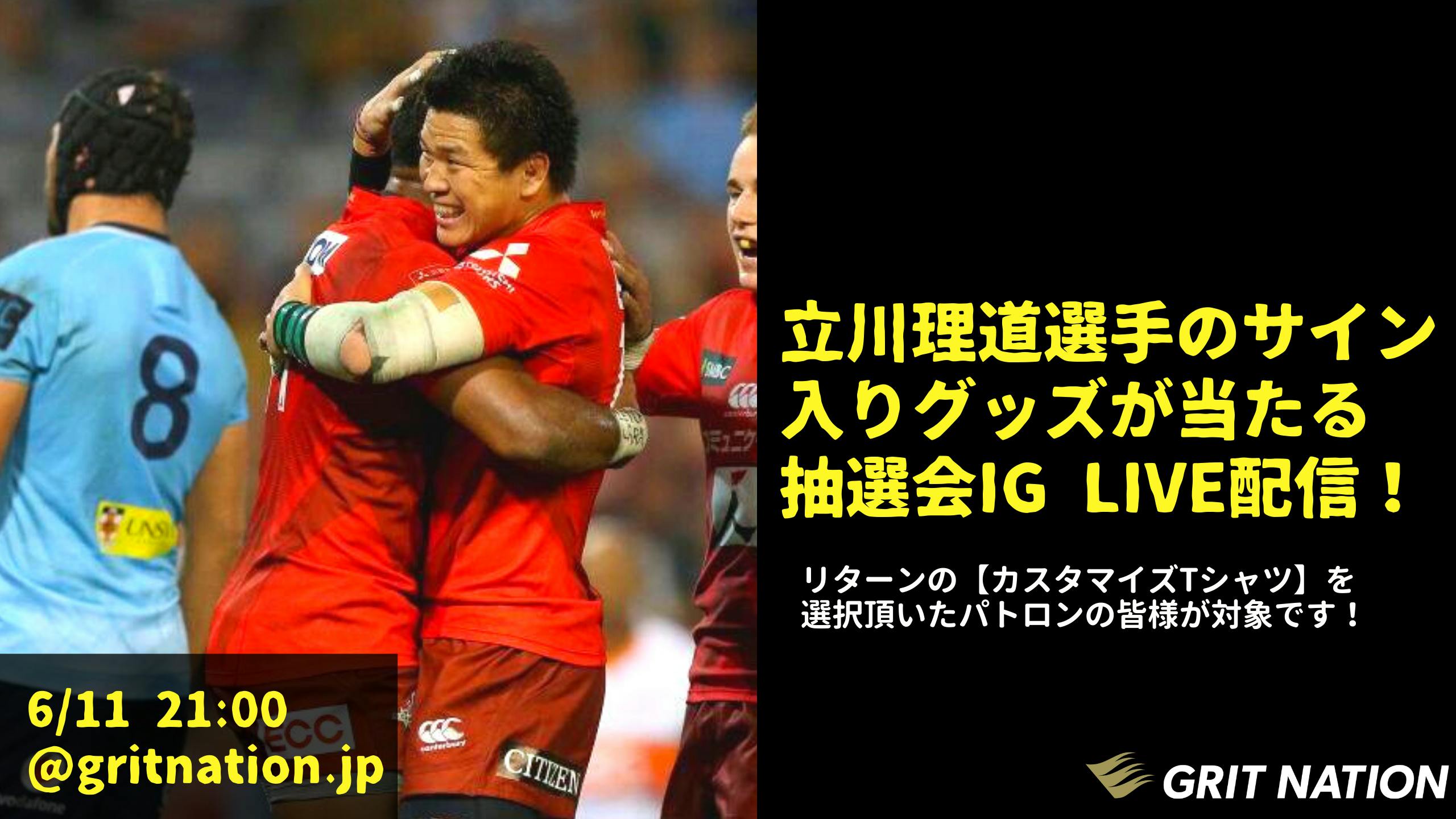 2020/06/11 16:25【ラグビー立川選手のサイン入りグッズが当たる抽選会を開催!!】本日21:00よりクラウドファンディング特別企画として、立川理道選手のサイン入りユニフォームが当たる抽選会をインスタライブにて配信します!プレゼントは立川理道選手が2019年3月29日サンウルヴズvsワラタス(アウェーにて31-29で勝利)で実際に着用したラグビージャージ(サイン入り)です!抽選対象者は以下リターンをご選択いただいた支援者の皆様です。【3Dスキャナー測定を活用したカスタマイズTシャツ1枚】【3Dスキャナー測定を活用したカスタマイズTシャツ3枚セット】【GRIT NATION1ヶ月通い放題 +3Dスキャン測定/カスタマイズTシャツ1枚】【GRIT NATION6ヶ月通い放題 +3Dスキャン測定/カスタマイズTシャツ1枚】またインスタライブには2015年ラグビーW杯「史上最大の番狂わせ」「ブライトンの奇跡」と呼ばれた南アフリカ戦勝利の立役者、クボタスピアーズのキャプテン立川理道選手ご本人にもご参加いただきますので、是非お見逃しなく。当選者には後日個別でご連絡もいたします。▶GRIT NATION公式インスタグラム はこちら もっと見る