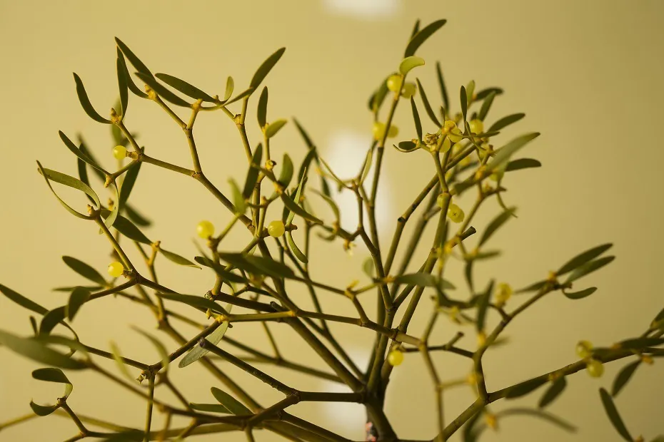 ▲「やどり木」のロゴ(上)は、ブナやサクラなどに鳥の巣のような見た目で自生する植物・ヤドリギ(下)から生まれました。ヨーロッパでは縁起のいい植物であり、葛巻ではよく目にします。