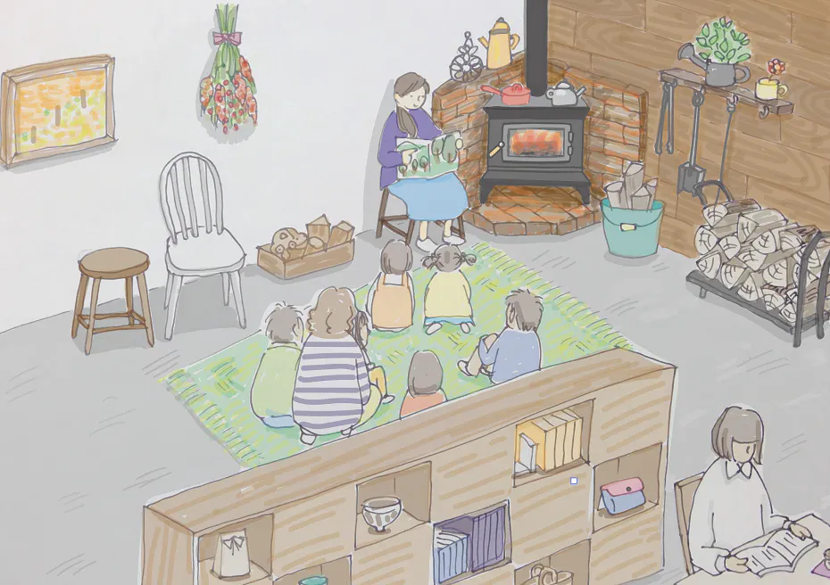 このイラスト(上)は、熊谷が描いた店内のイメージです。薪ストーブが設置されたら、例えばこんなイベントを考えています。