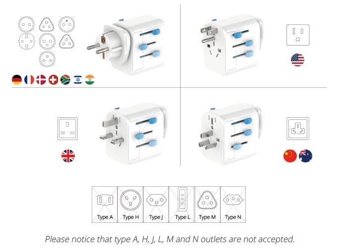 Passport Proはまた、タイプB, C, D, E, F, G, I, K,Oのコンセント形状(アウトレット)に対応しています。