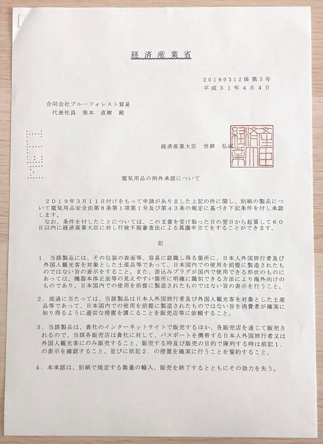 本商品は、日本国内での使用を前提とせず、海外で使用する前提で設計及び経済産業省による販売許可を受けております。