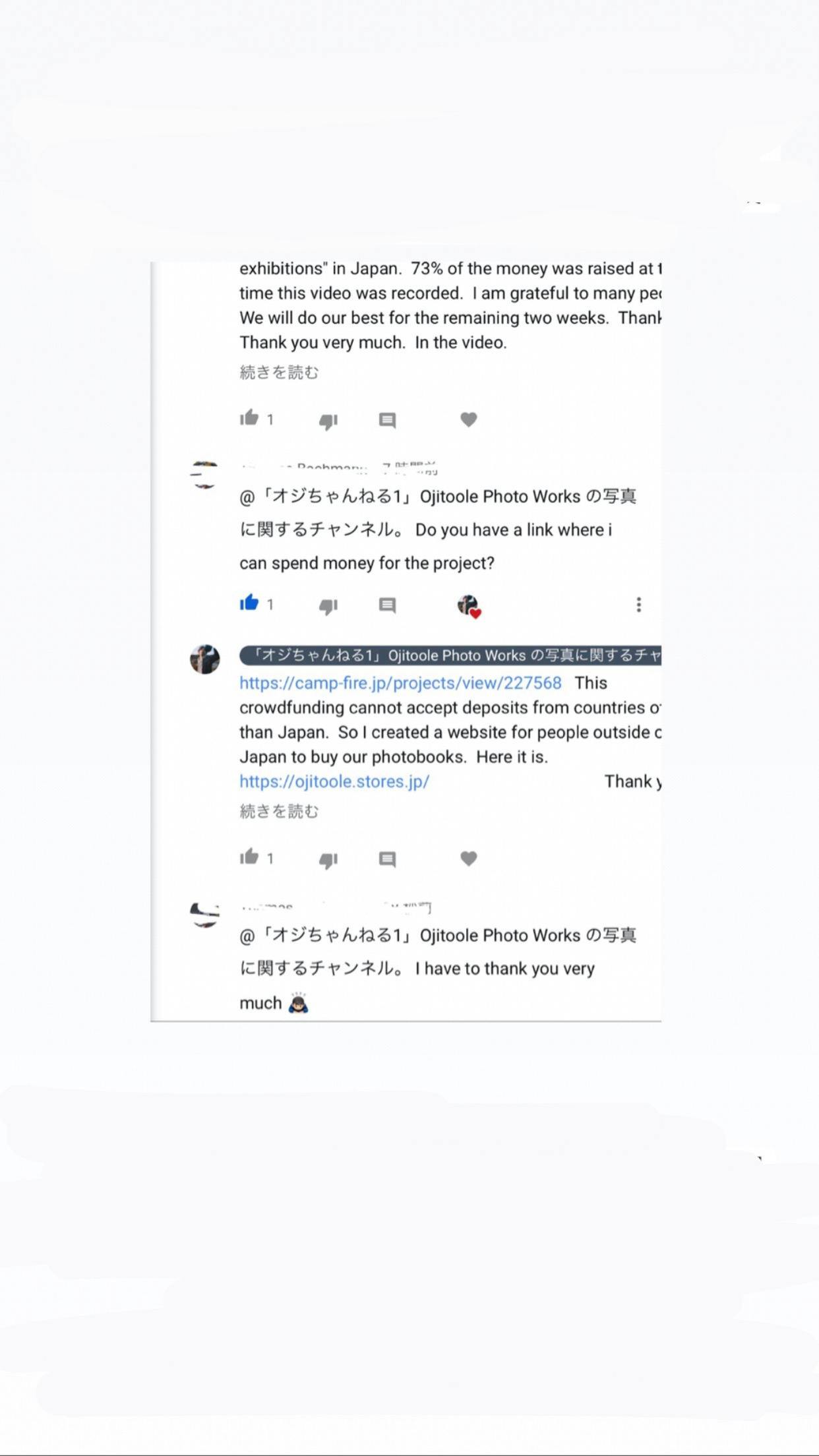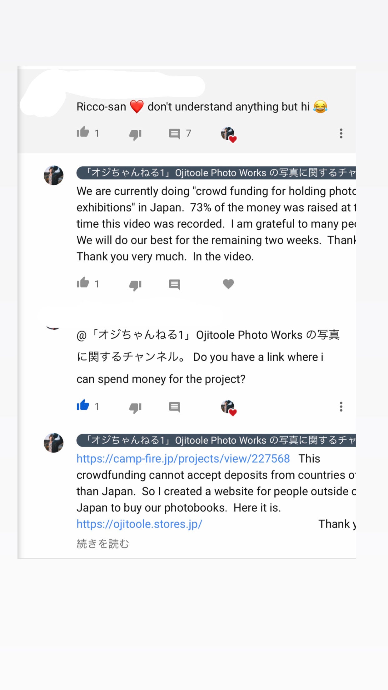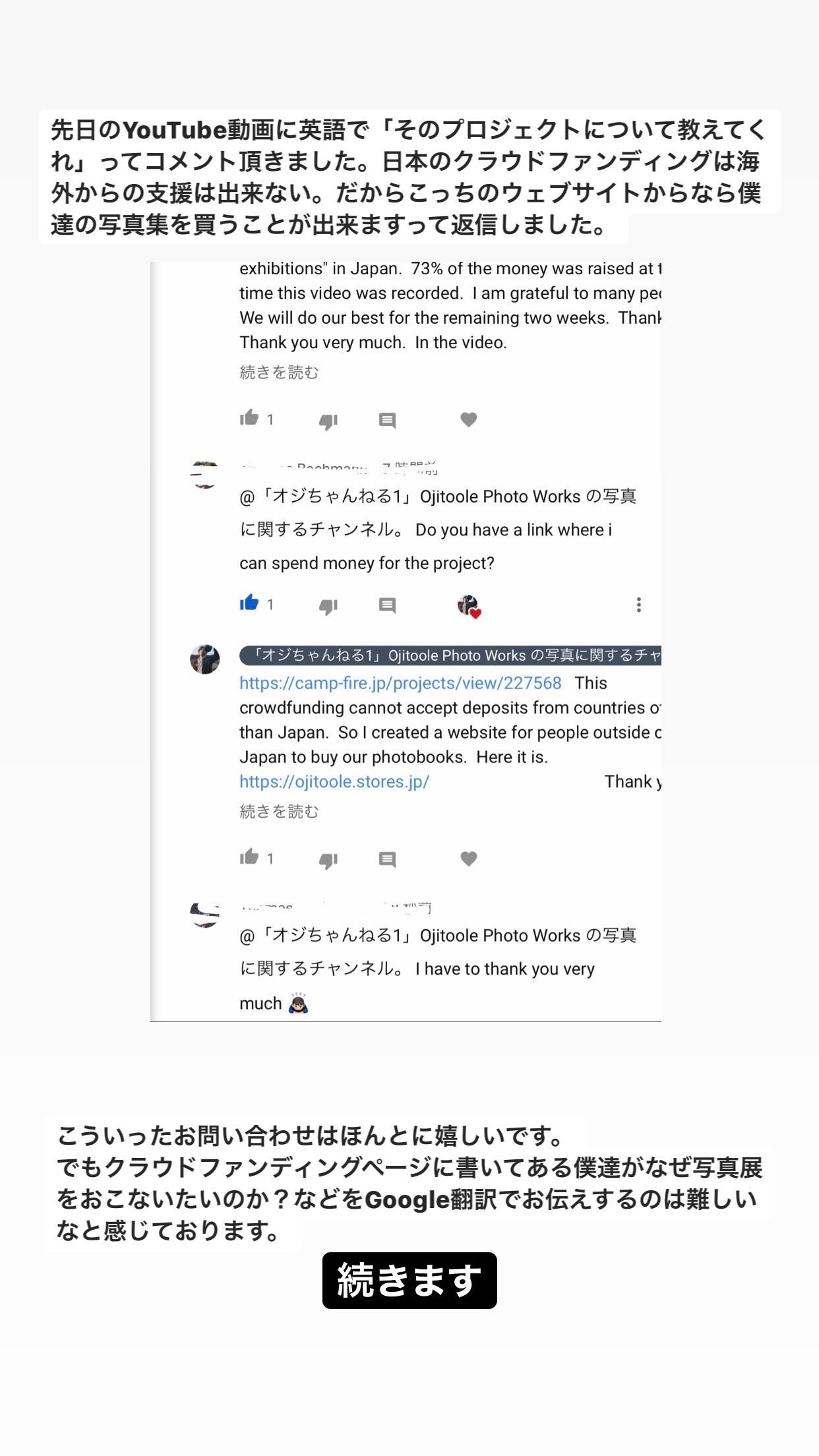 日本でクラウドファンディングをやっている。それは僕達の写真展を開催するためです。リターンとして僕達の写真集を用意してる。だけど海外からの支援は受け付けられないから、別のサイトを作ったからそこから手に入ります。
