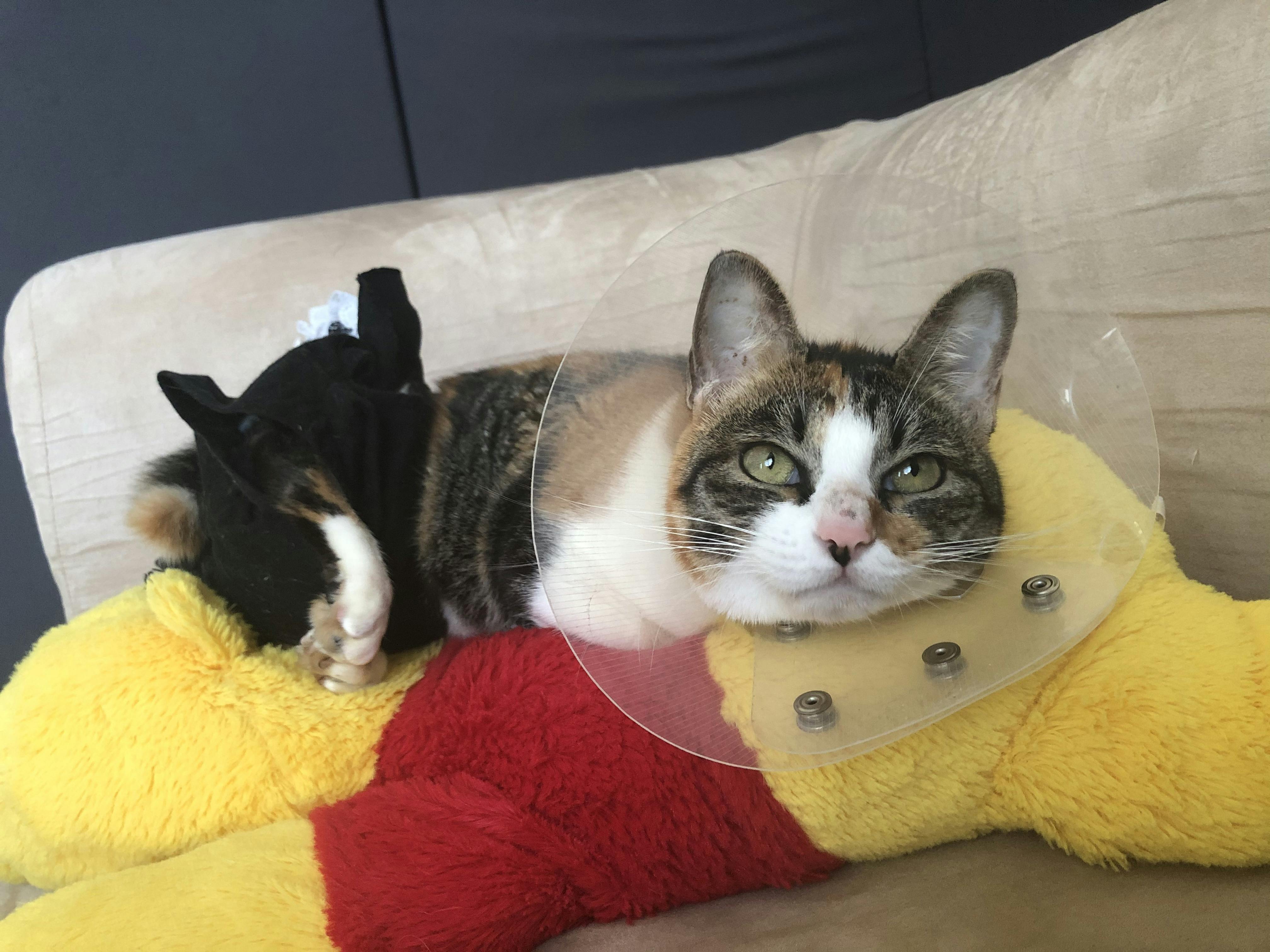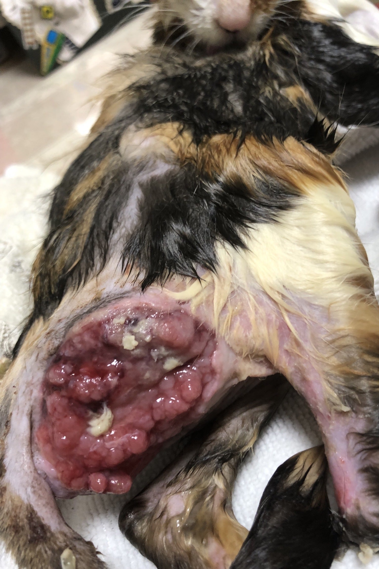 お尻の傷が垂れ流しのおしっこのせいで壊死をし 長期に渡る 治療と場合によってはお尻の穴が塞がったことに対する手術や皮膚の移植手術を要するとのことではありましたが2/8現在では 劇的な回復をみせており 移植手術の必要性はなくなりました。