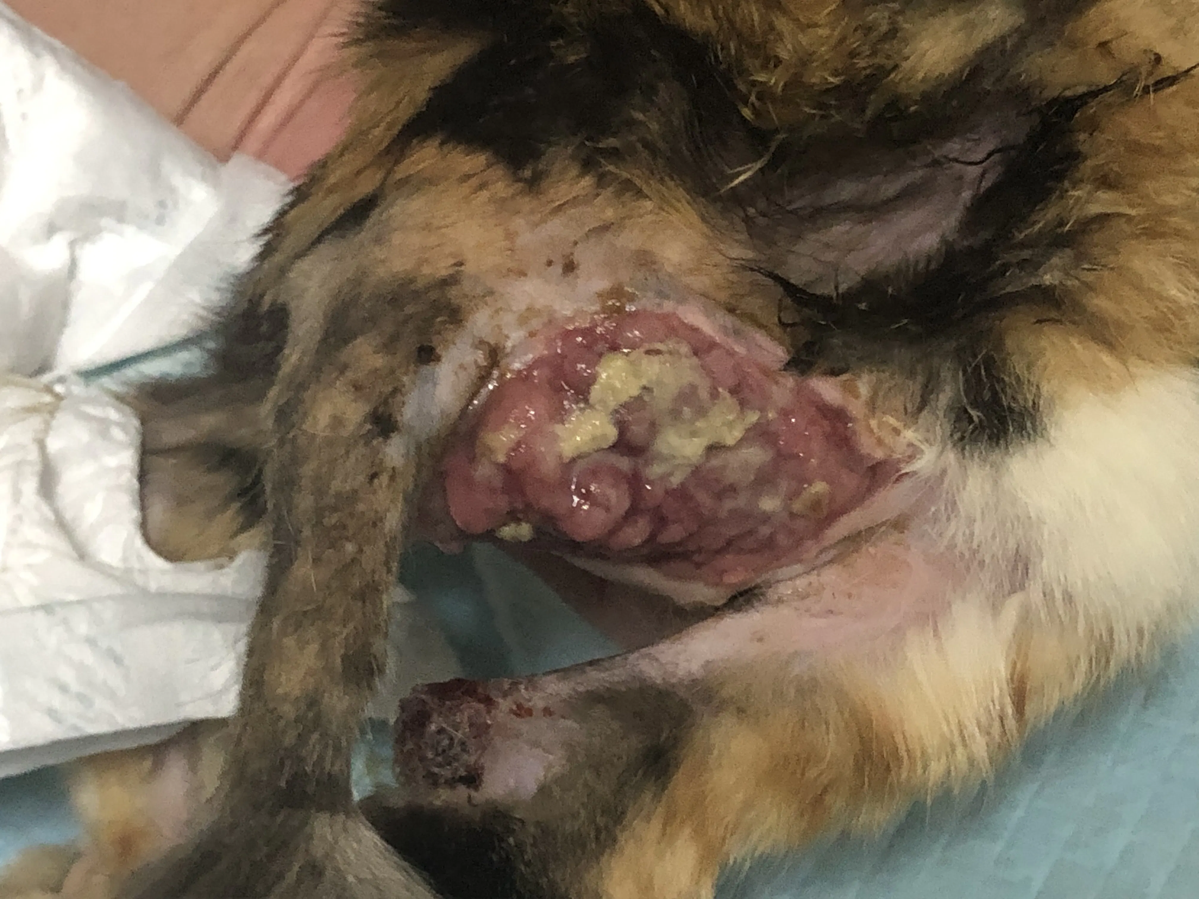 お尻の壊死、当初は赤い肉が盛り上がり 血も滲んでおりましたが 軟膏と投薬治療で少しずつではありますが 順調に介抱に向かっております。黄色いウミが出た後でピンクになった段階で次の治療法が決まることと思います。引き続き お尻の洗浄と投薬、塗り薬を続けて参ります。