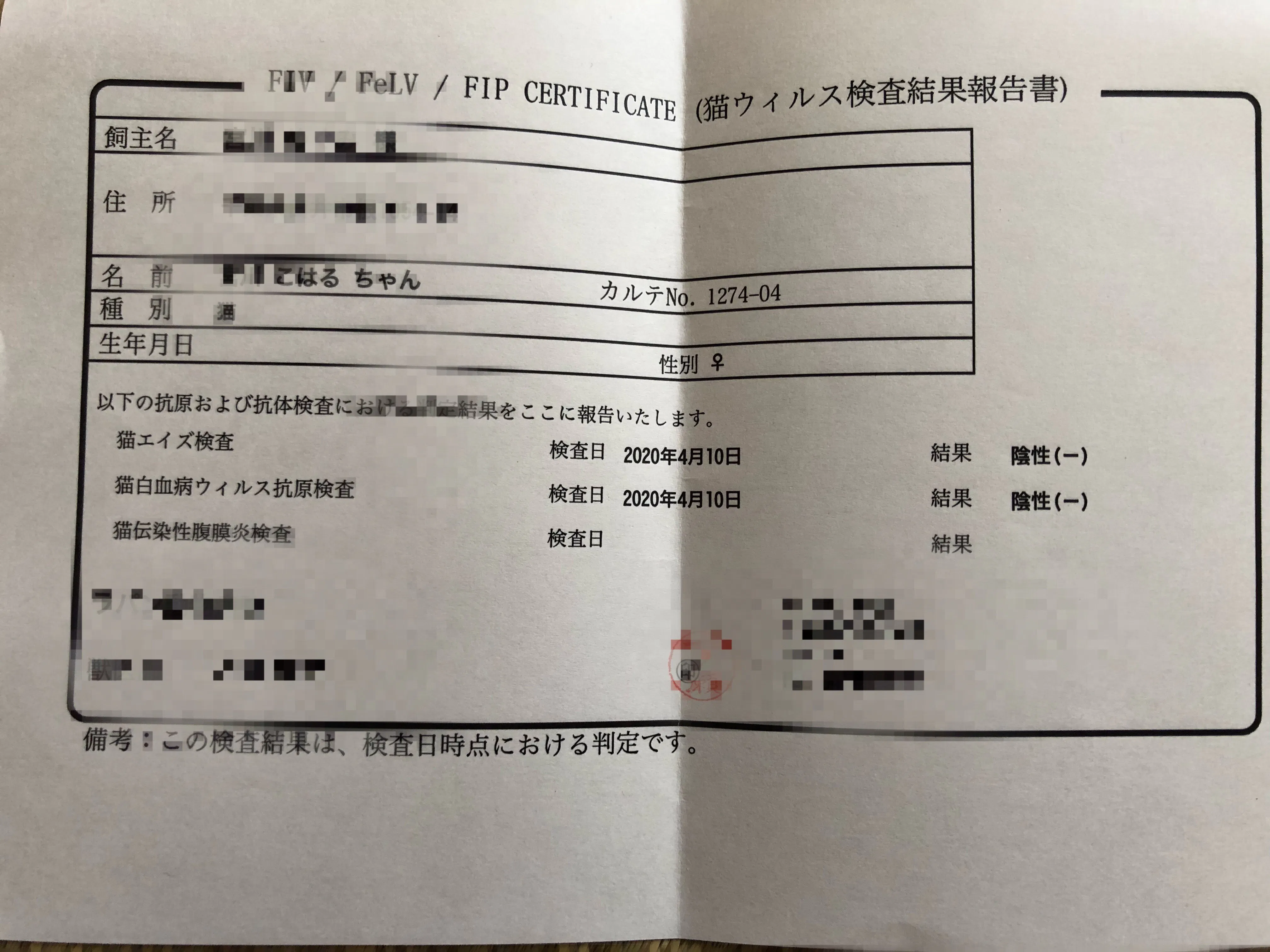 前回 検査結果が出ず 今回 再度採血した結果、猫エイズ、猫白血病共に陰性と出ました。
