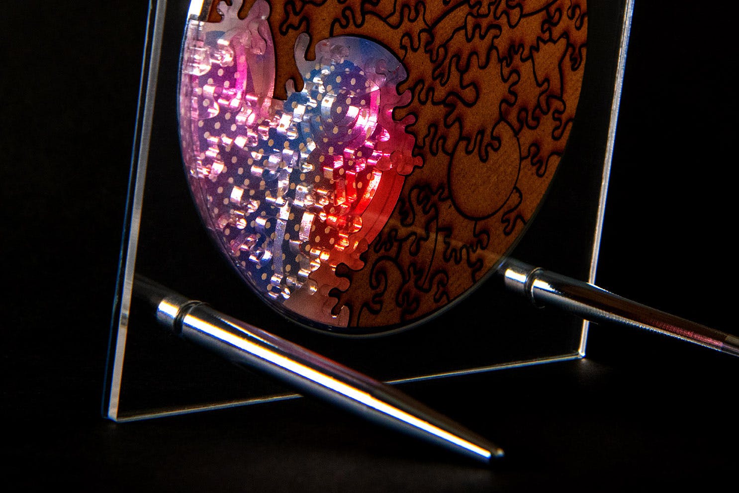 木製ピースの他に、一部のピースは光を通すアクリルでできており、これら透明のピースが惑星に流れる川やガスの動きに生命を与えます。