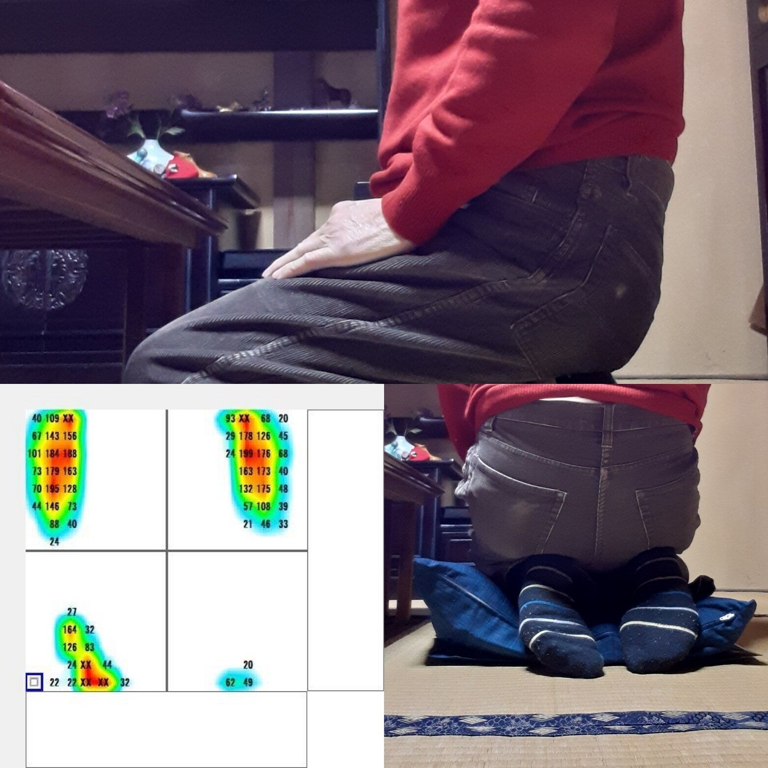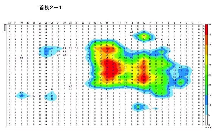 これは当社の首枕で体圧を測定した結果です。横軸の5の所に首枕が措かれています。このことで、胸部と臀部の所に圧力が多くかかります。これは普通の枕で、頭を支えますから横軸の4の所に枕が措かれています。胸部も臀部も、当社の枕に比べて圧が少ないです。胸部は枕が頭を支えていますから、浮いてきます。その分、臀部に強く圧力が加わります。だから、立位の姿勢で寝なさい!!と薦めている訳です。今回は姿勢の話。この図をみて愕然としました。私なのですが、姿勢が悪いですね。左に傾いています。臥位(寝姿)がこれですから立位も座位も悪いです。座るだけで骨盤矯正なる商品がありますが・・・信じません。何十年も掛けて曲がった身体が、座るだけで治る訳ありません。だから、これからの人々は姿勢に注意して健康な生活を送って頂きたいのです。