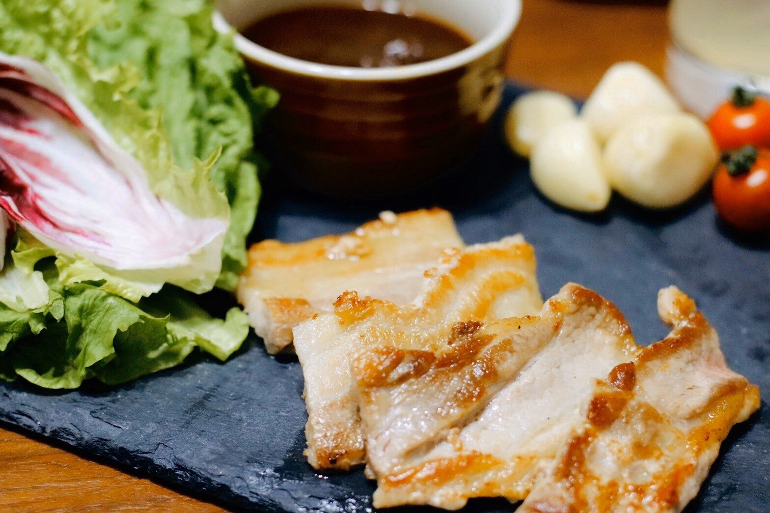 サムギョプサル 大人気の豚肉料理です。お野菜で巻いて召し上がっていただきます。