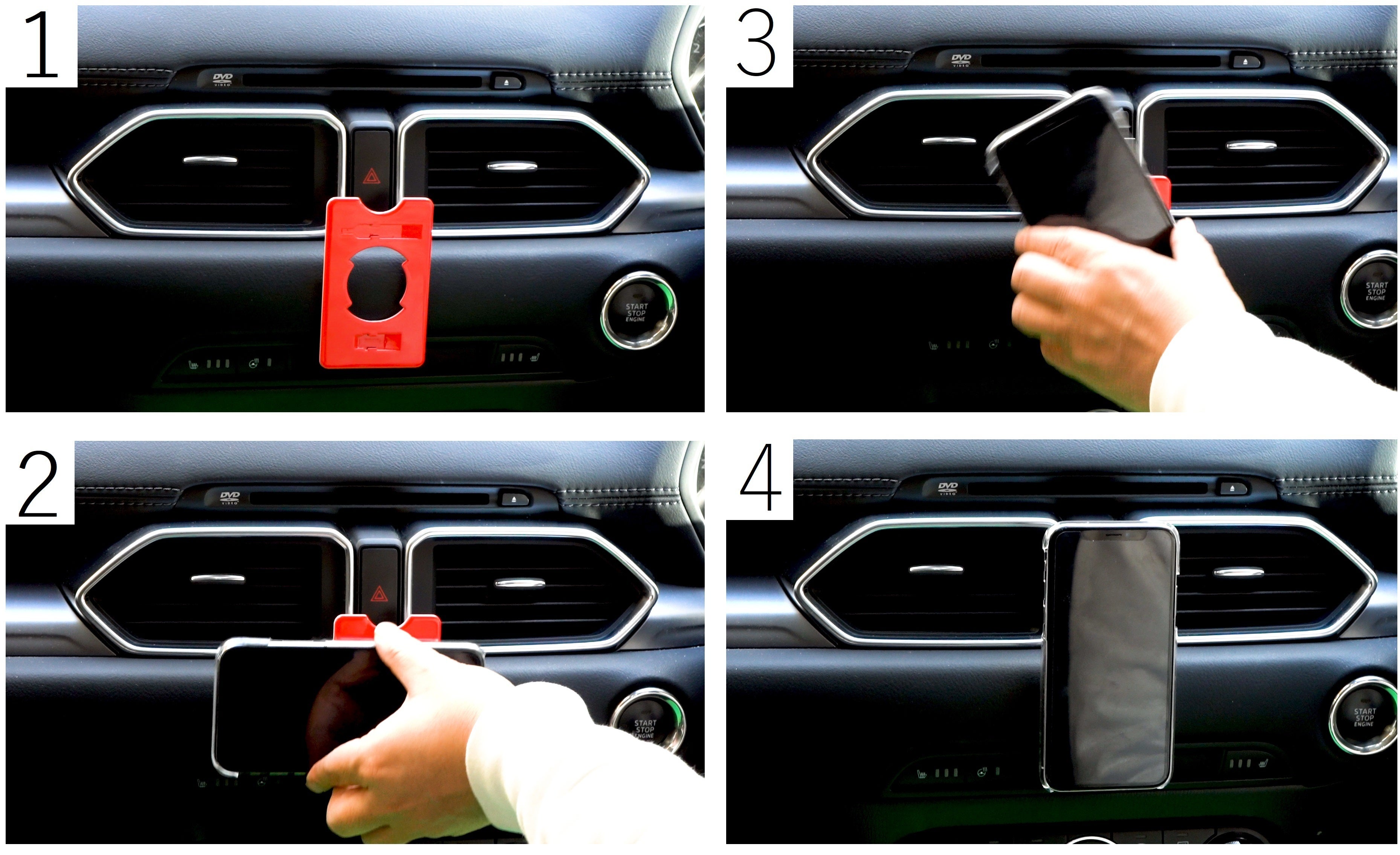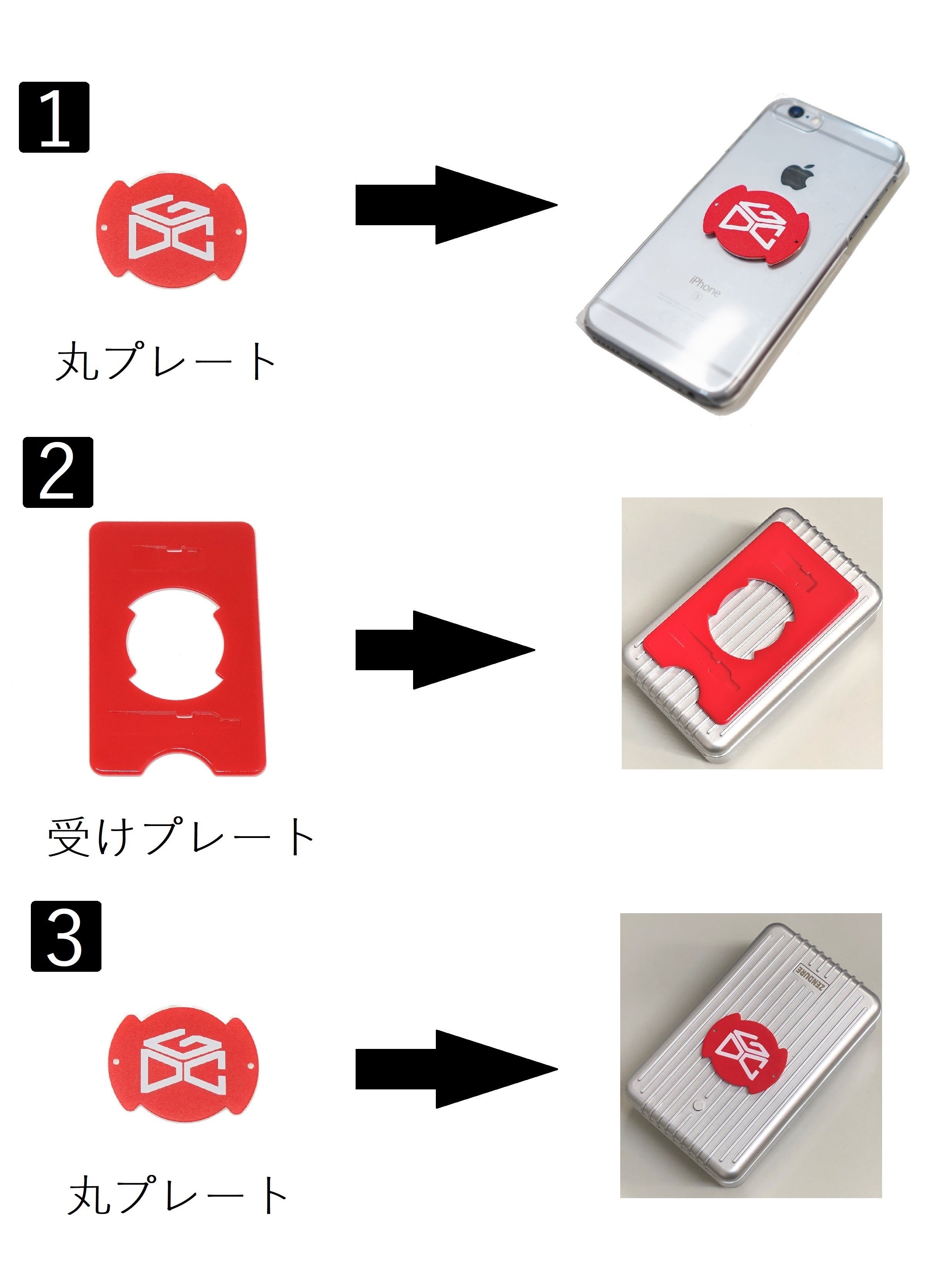 ・受けプレートを取り付け、丸プレートの付いたスマホをドッキングするだけ!