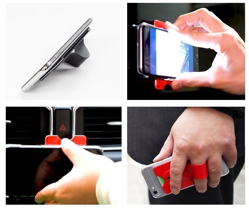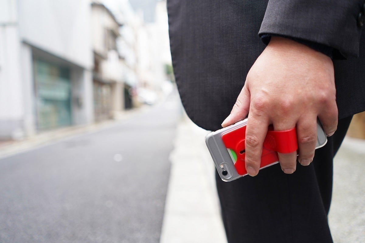 【モバフィ】はスマートフォンに取り付けるカードホルダー。背面のバンドをスライドすることによって落下防止のスマホバンドとしてもご使用になれます。