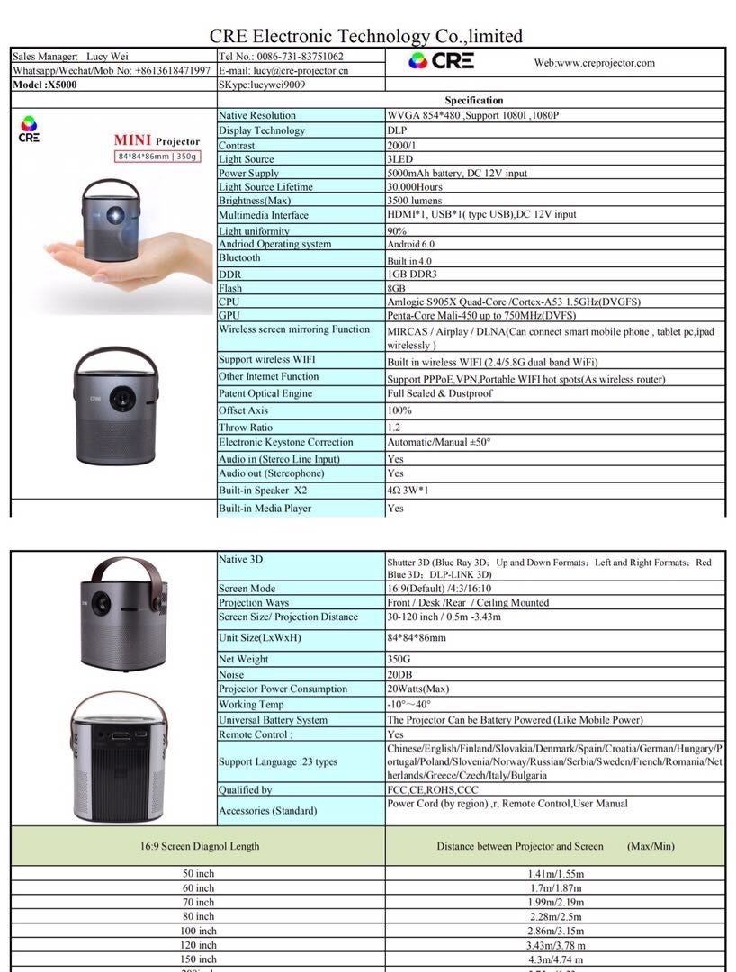 CREX5000は120インチまで対応できます。明るさの指針となるルーメンの数値は、モバイルプロジェクターの場合は100ルーメンから500ルーメンであれば、暗い場所なら綺麗に映る明るさです。1000ルーメンに近づいてくると明るい部屋でも使える強さになります。(こちらをご参照下さい)