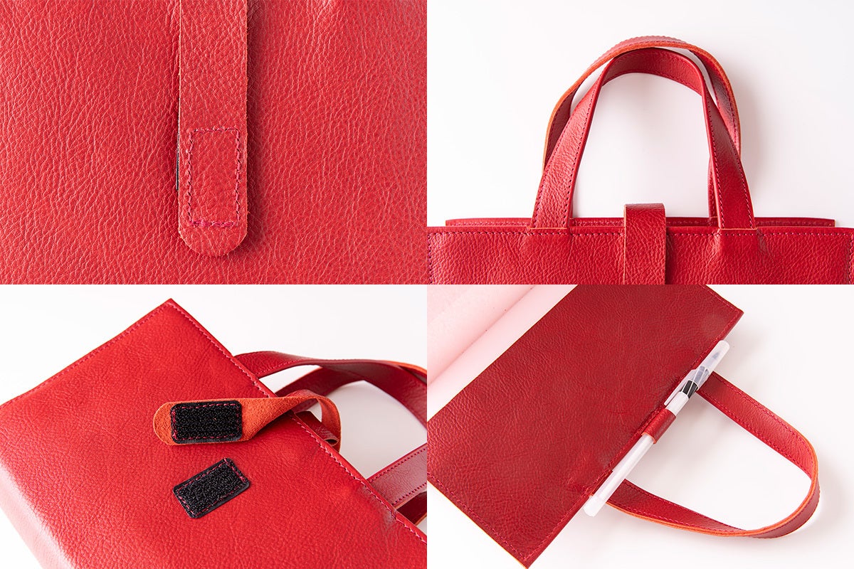開閉部のマジックテープ、負荷のかかるハンドル部分、出し入れの多いペンケース部分、それぞれ日本の革職人が高い技術力で1点1点、ていねいに縫製しております。