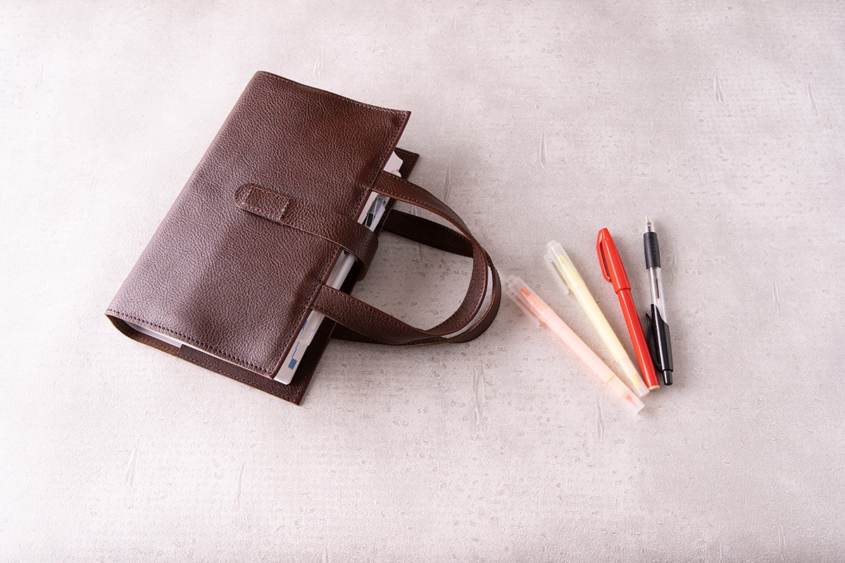 付箋やメモで膨らんでいくレビューブック。その膨らみをカバーする広め目のマチとマジックテープホルダー。